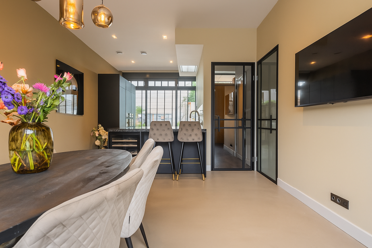 De keuken loopt naadloos over in het eetkamergedeelte met voldoende ruimte voor een grote eettafel. Middels de openslaande deuren is er toegang tot de besloten stadstuin.