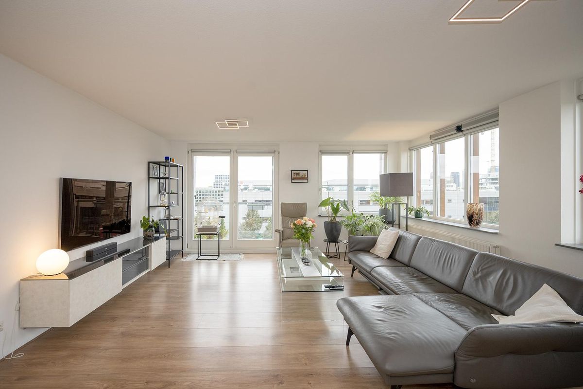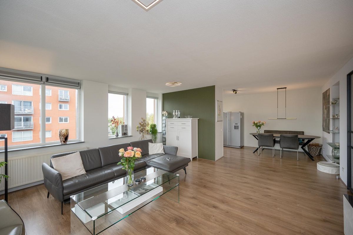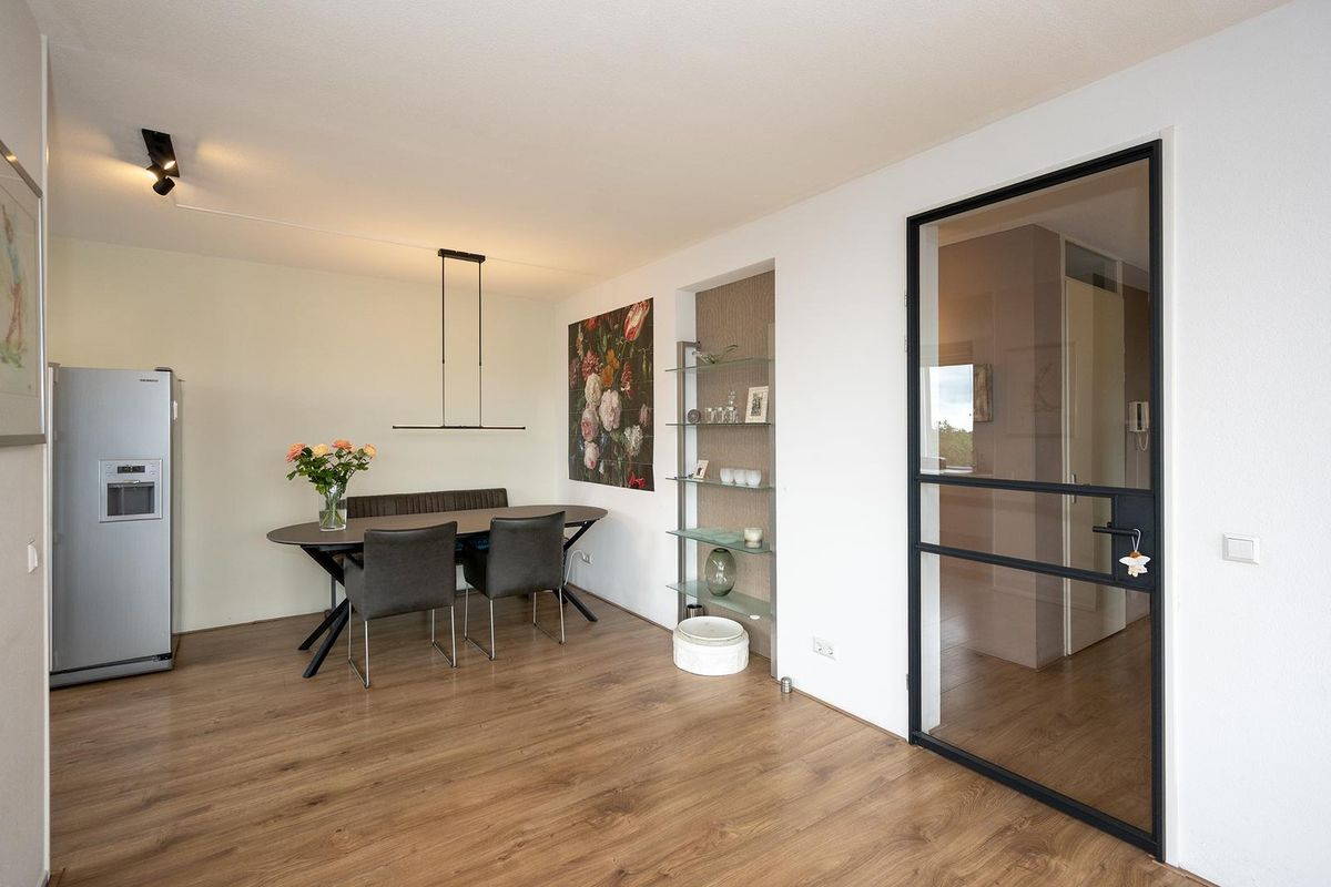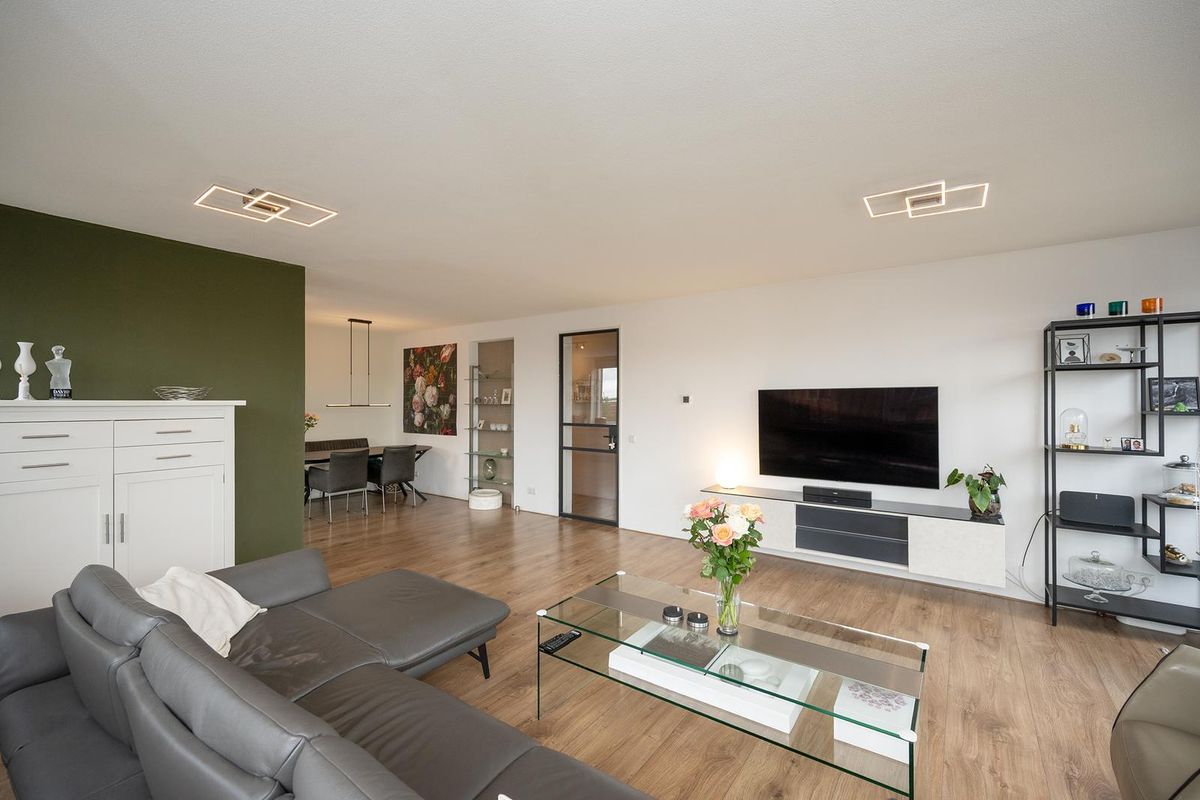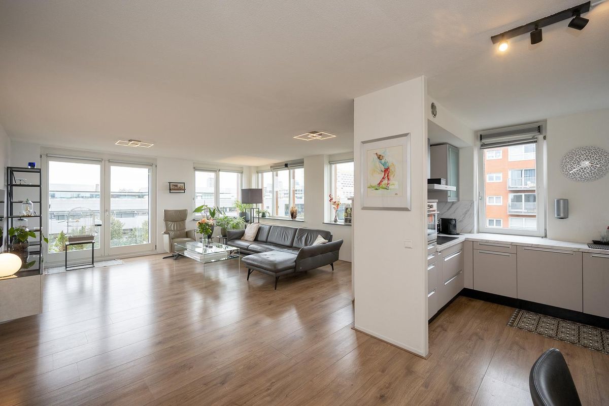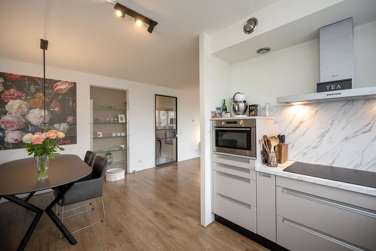 De royale woonkamer met open keuken ligt aan de voorzijde van het appartement en is dankzij de grote raampartij heerlijk licht. De sfeervolle indeling zorgt voor een warme, huiselijke uitstraling.