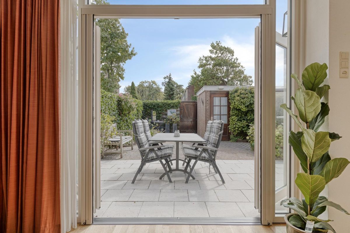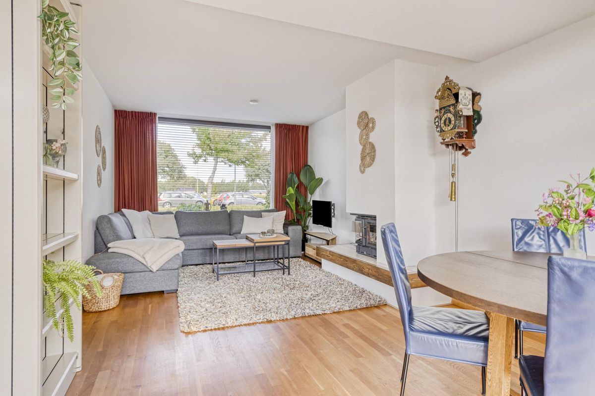 De doorzonwoonkamer is door de grote raampartijen heerlijk licht en heeft openslaande deuren naar de tuin. De vloer is v.v. eiken vloerdelen, spachtelputz wanden en heeft een sfeervolle Barbas houthaard.