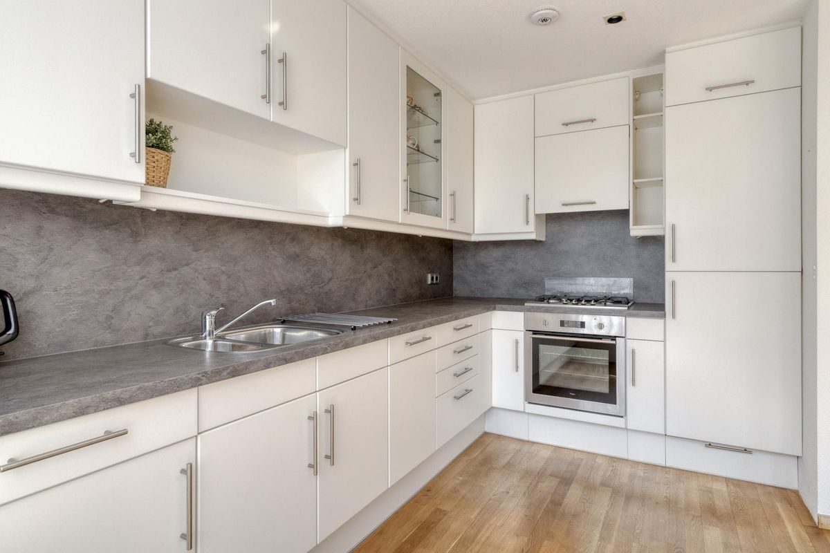 De open keuken in hoekopstelling bevindt zich aan de achterzijde van de woning en is v.v. spoelunit, vaatwasmachine, oven, 4 -pits gaskookplaat, afzuigkap, en koel-vriescombinatie. Via de achterdeur is er toegang tot de tuin.
