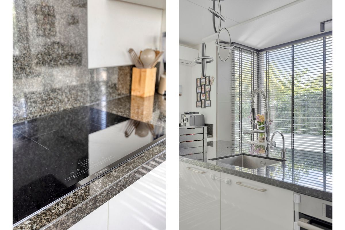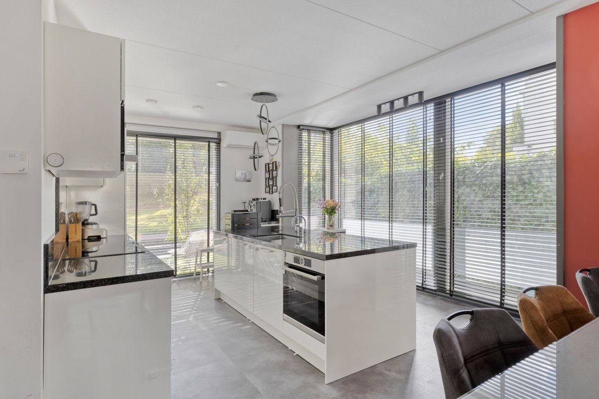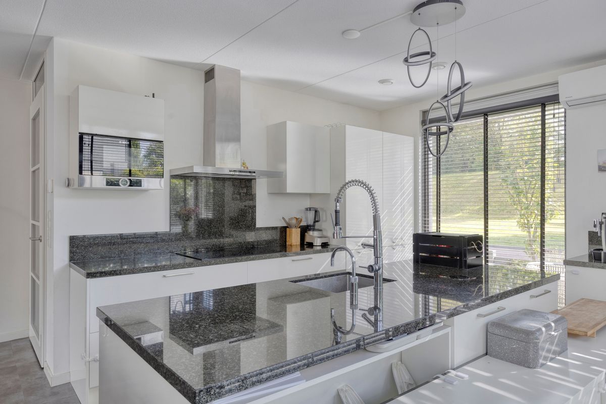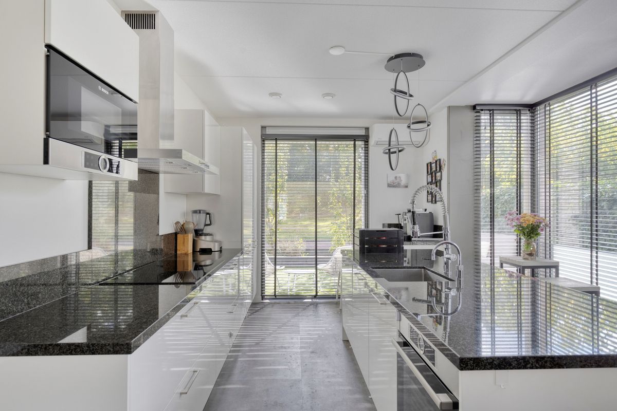 De keuken is voorzien van een rechte kastenwand tegen de muur met een inductiekookplaat en afzuigkap, grote koelkast, grote vriezer, magnetron, brede lades en een separate koffie-nis met onderkastje. Verder bevat de keuken een spoel/kasteneiland met vaatwasser, Quooker, en oven. De werkbladen zijn van graniet en in de keuken is de airconditioning voor deze verdieping gepositioneerd (Daikin, 2023).