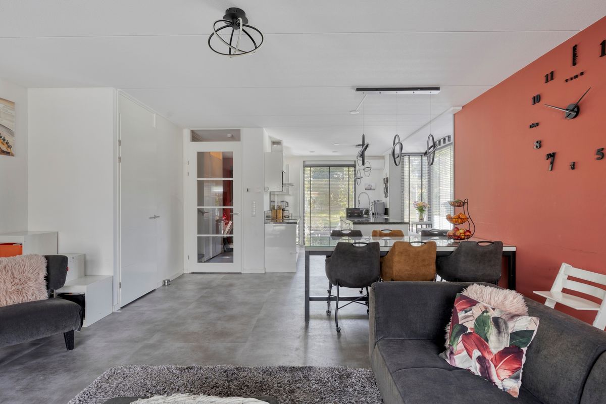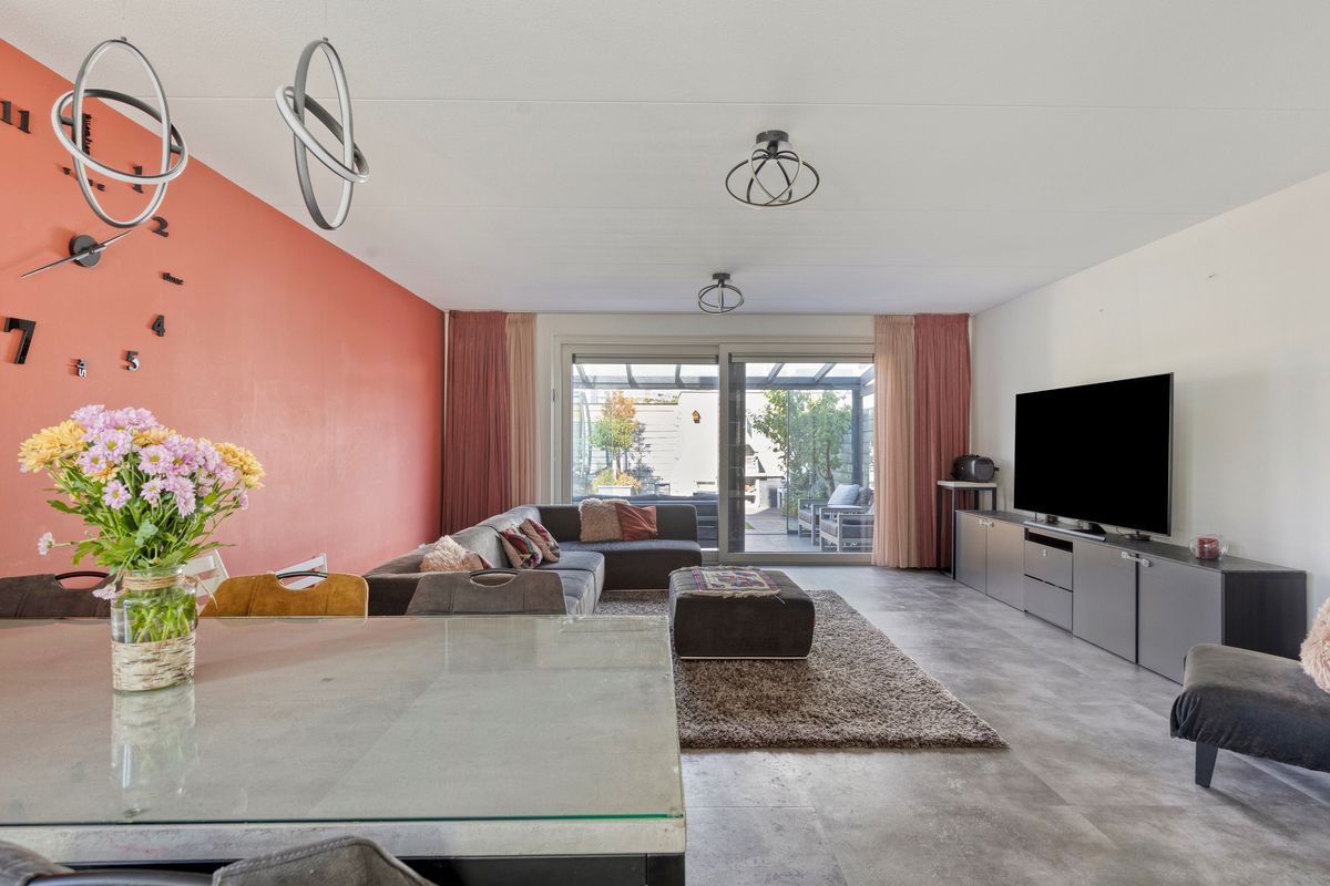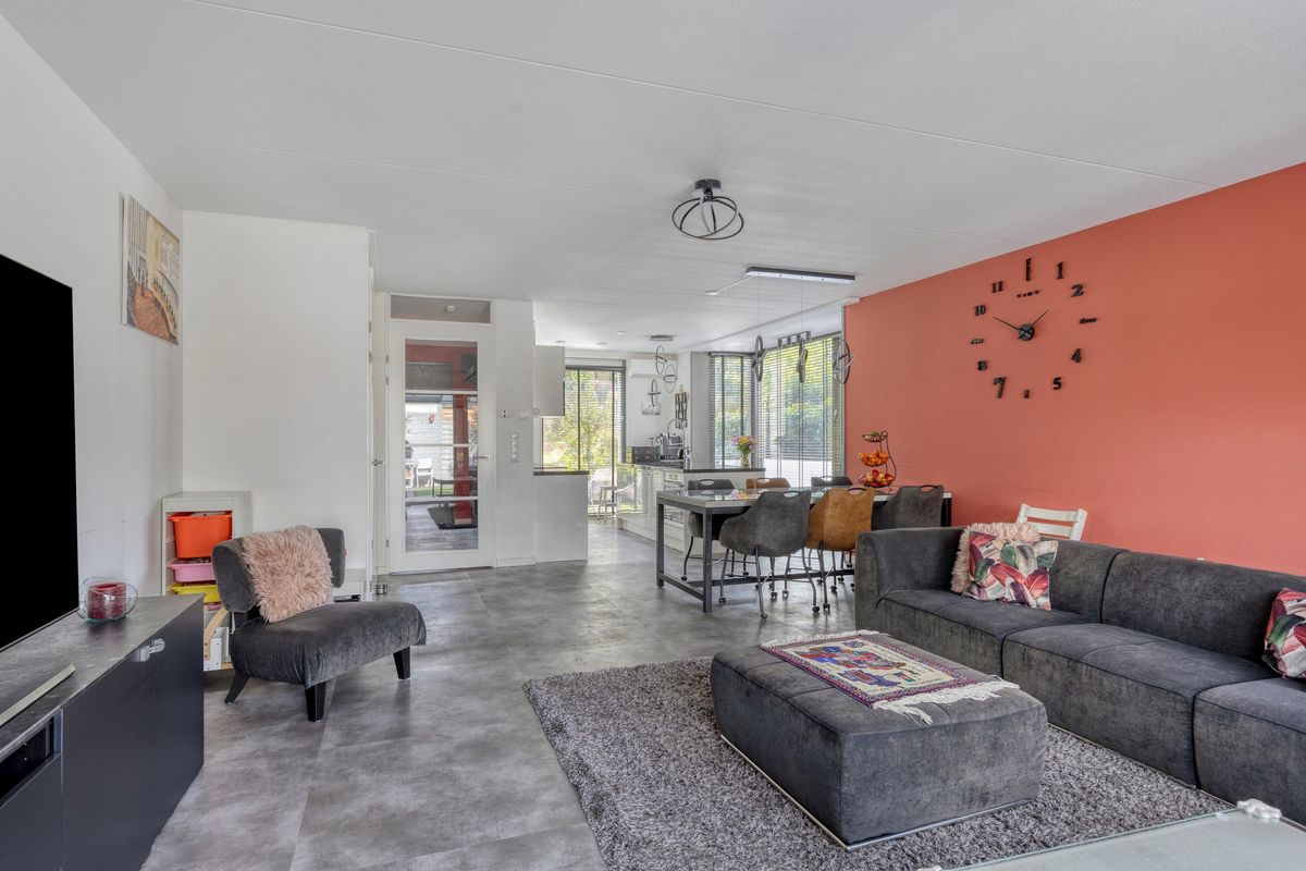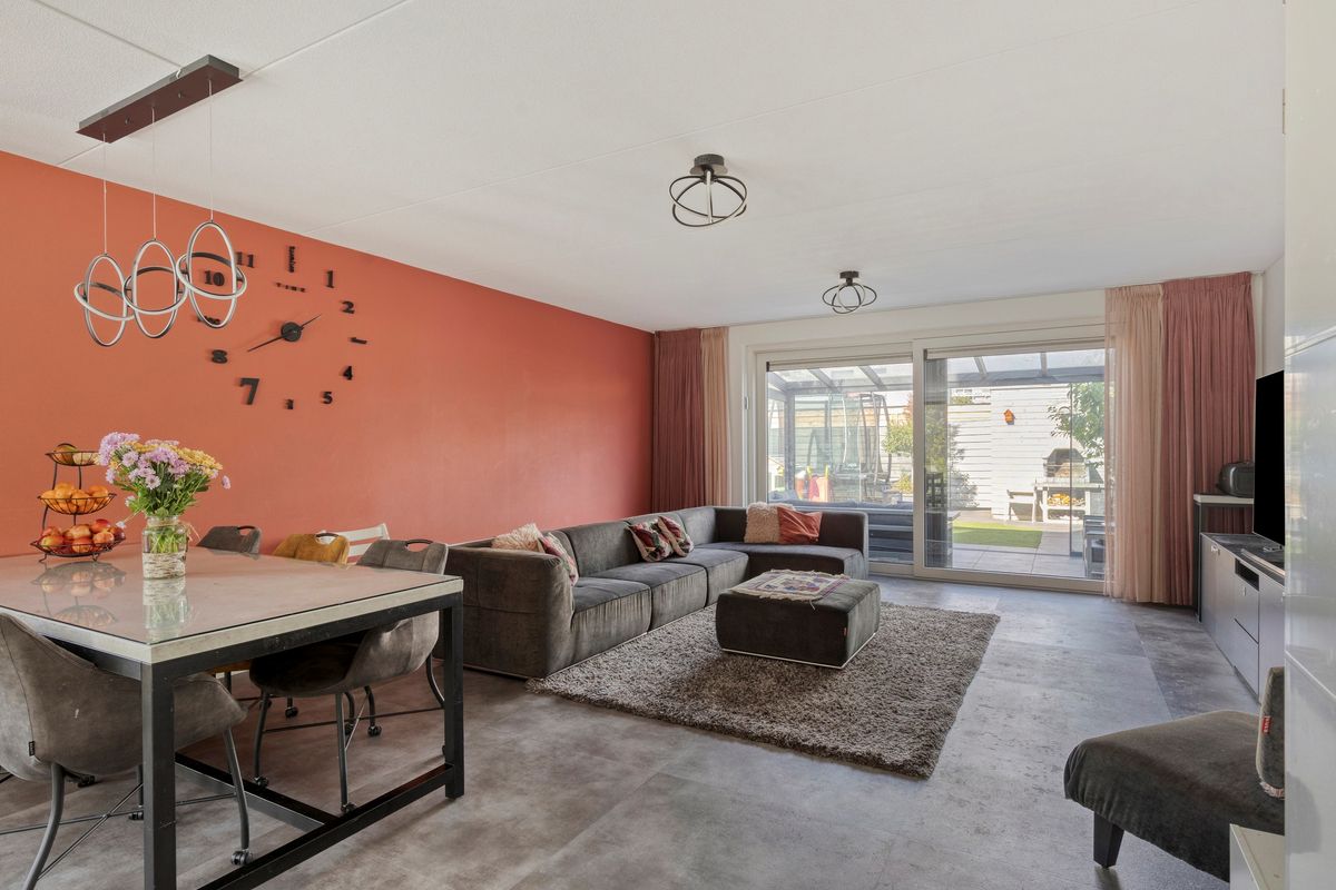 Woonkamer, een royale en uitgebouwde woonkamer met een brede kunststof schuifpui die toegang biedt tot de achtertuin.