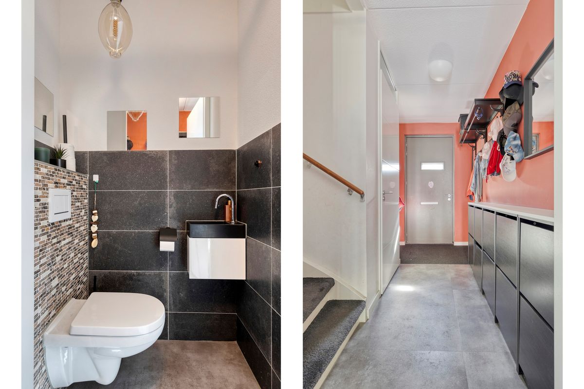 Toilet, grotendeels betegeld, voorzien van een hangend closet en een fonteintje met onderkastje.