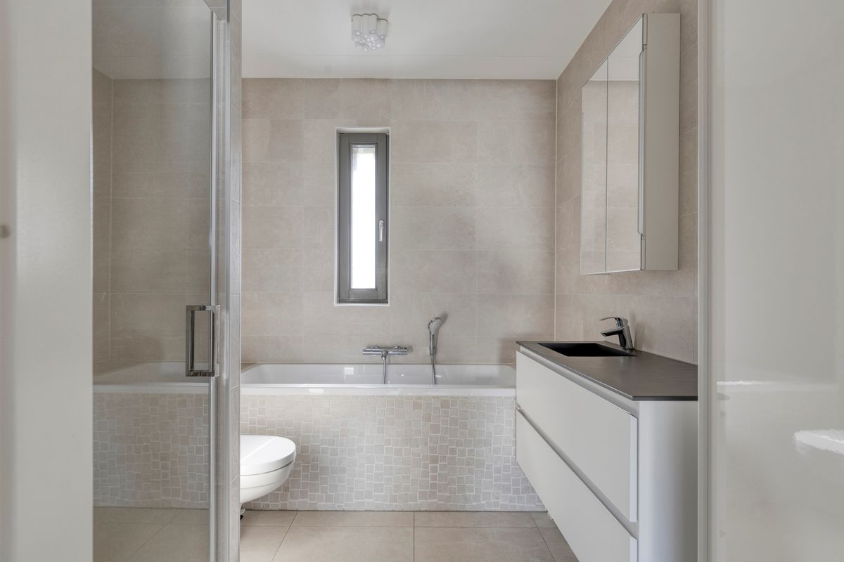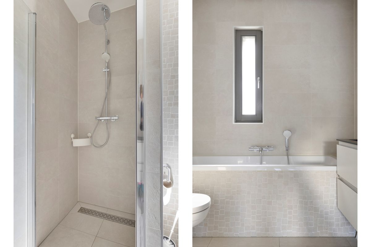 Badkamer, geheel betegelde ruimte, voorzien van een groot ligbad met thermostaatkraan, inloopdouche met thermostaatkraan, rainshower en handdouche, badkamermeubel met wastafel, een spiegelkast met verlichting, onderladen en kolomkast.