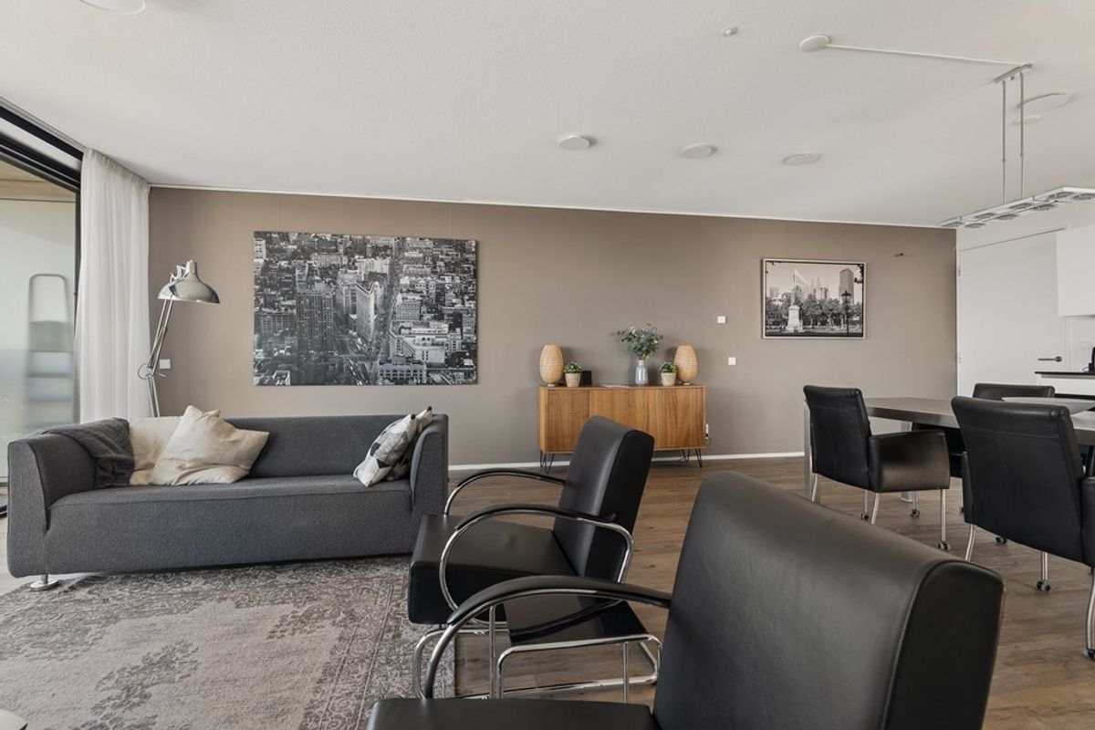De royale woon- en eetkamer vormt het hart van de woning. Grote raampartijen van vloer tot plafond zorgen voor een prachtige lichtinval en laten binnen en buiten moeiteloos in elkaar overlopen. De schuifpui geeft toegang tot het balkon van circa 9 m², dat zich uitstrekt over de volledige breedte van het appartement – een perfecte plek om te genieten van het uitzicht op elk moment van de dag.