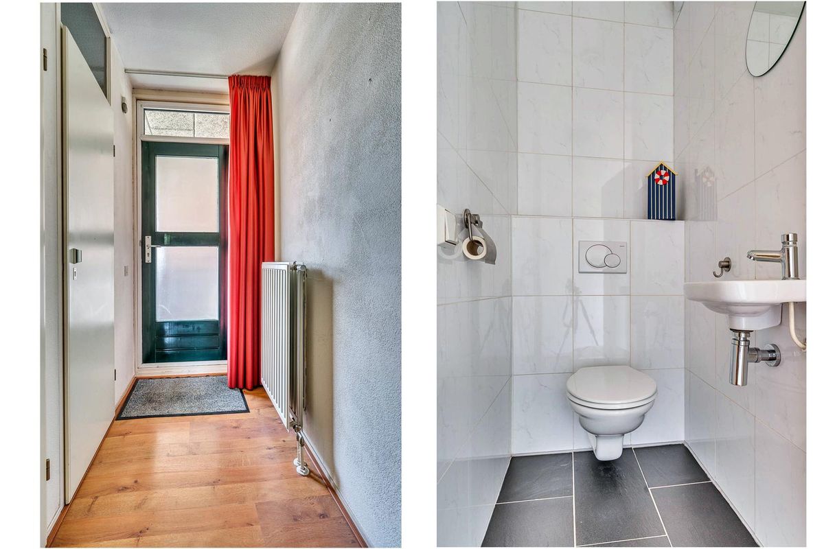 De ruime ontvangsthal geeft toegang tot de separate toiletruimte, berging, trapgang naar de 1e verdieping van de maisonnette en de woonkamer. De geheel betegelde toiletruimte is voorzien van een zwevend toilet, fonteintje en mechanische ventilatie. Naast het toilet is de inpandige berging waar de CV-ketel is geplaatst van het merk Intergas met bouwjaar 2015. Middels een loopdeur is de woonkamer met halfopen keuken te betreden. De woonkamer is ruim van opzet en geeft toegang tot het balkon. De keuken is voorzien van een 4-pits gasfornuis, afzuigkap, oven, koelkast, diepvries en veel opbergruimte. Verder is er een trapkast onder de trap.