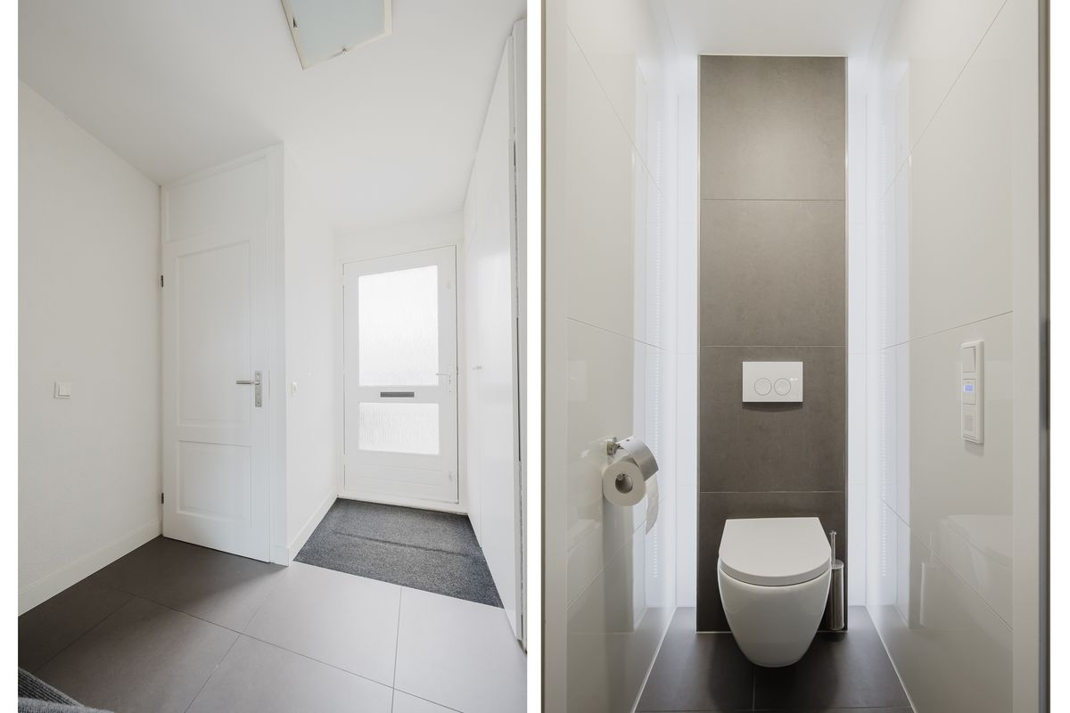 Woningentree met toegang tot de hal. De hal met garderobe en de meterkast, een modern toilet, de trapopgang en toegang tot de woonkamer.