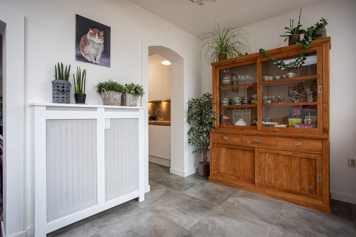 Aan de tuinzijde ligt de keuken, vernieuwd in 2020. De keuken kenmerkt zich door de witte keukenkastjes en het houten werkblad. Je beschikt hier over de volgende apparatuur: afzuigkap, vaatwasser, gasfornuis, combi oven en magnetron en een koelkast met vriescombinatie. Vanuit de keuken loop je zo door richting de achtertuin.