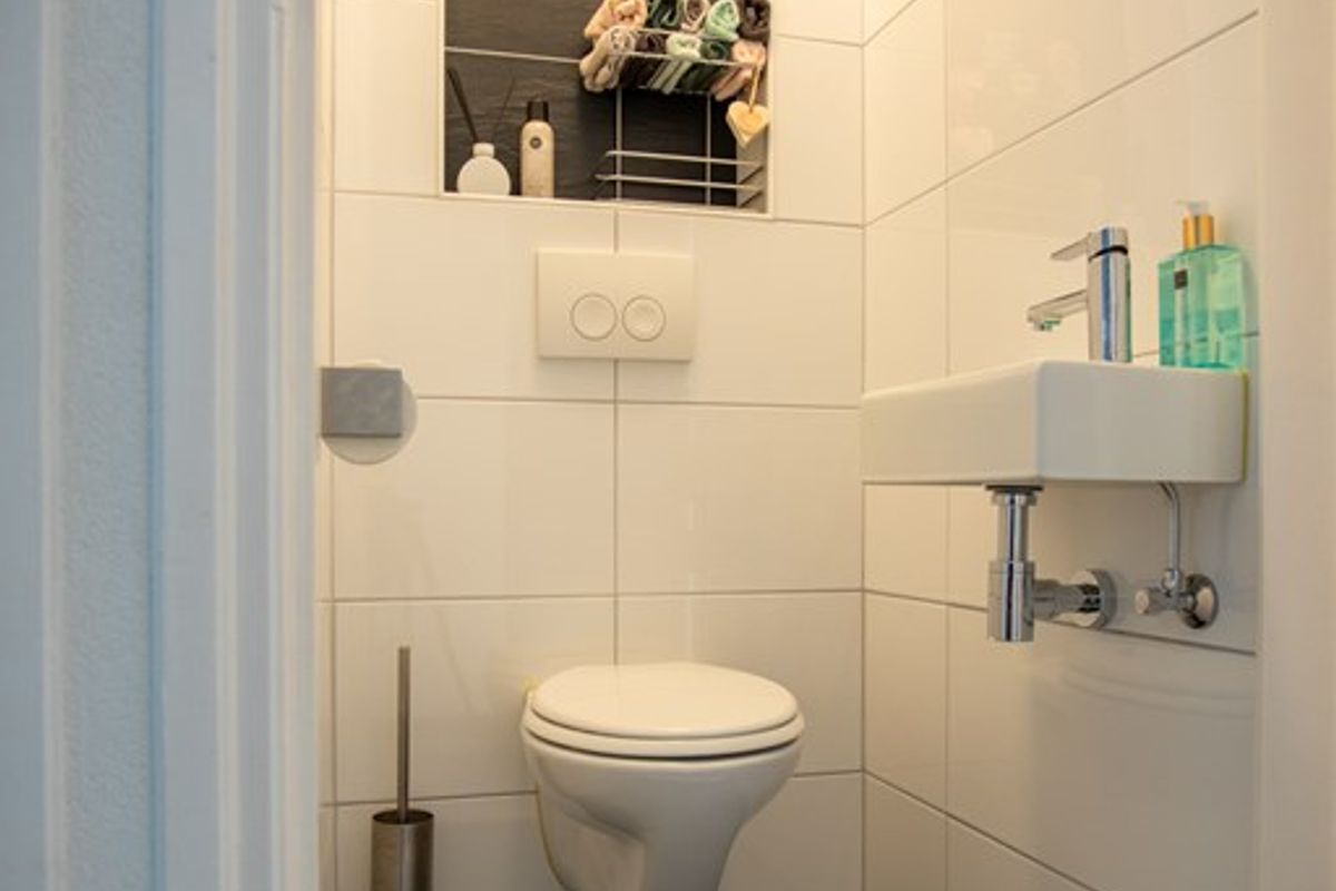 Via de westgerichte voortuin met luifel bereik je de voordeur. Achter de voordeur kom je binnen in de entree met meterkast, trapopgang en toegang tot het toilet, dat is uitgevoerd met een zwevend toilet en fonteintje.