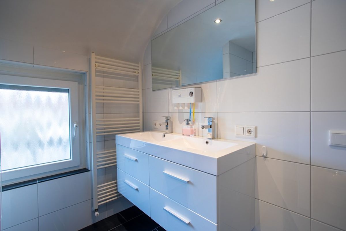 De badkamer is netjes betegeld en ingericht met een douche, een zwevend toilet en een wastafelmeubel.