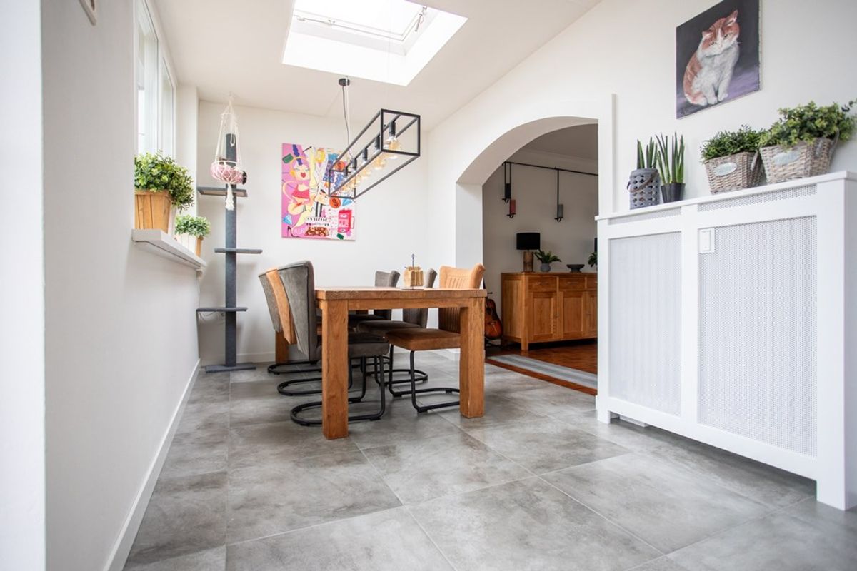 At the rear, overlooking the garden, you will find the kitchen, renovated in 2020. The kitchen features white cabinets and a wooden worktop. The following appliances are available: extractor hood, dishwasher, gas stove, combination oven and microwave, and a fridge freezer combination. From the kitchen you can walk straight into the backyard.