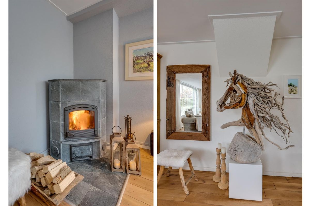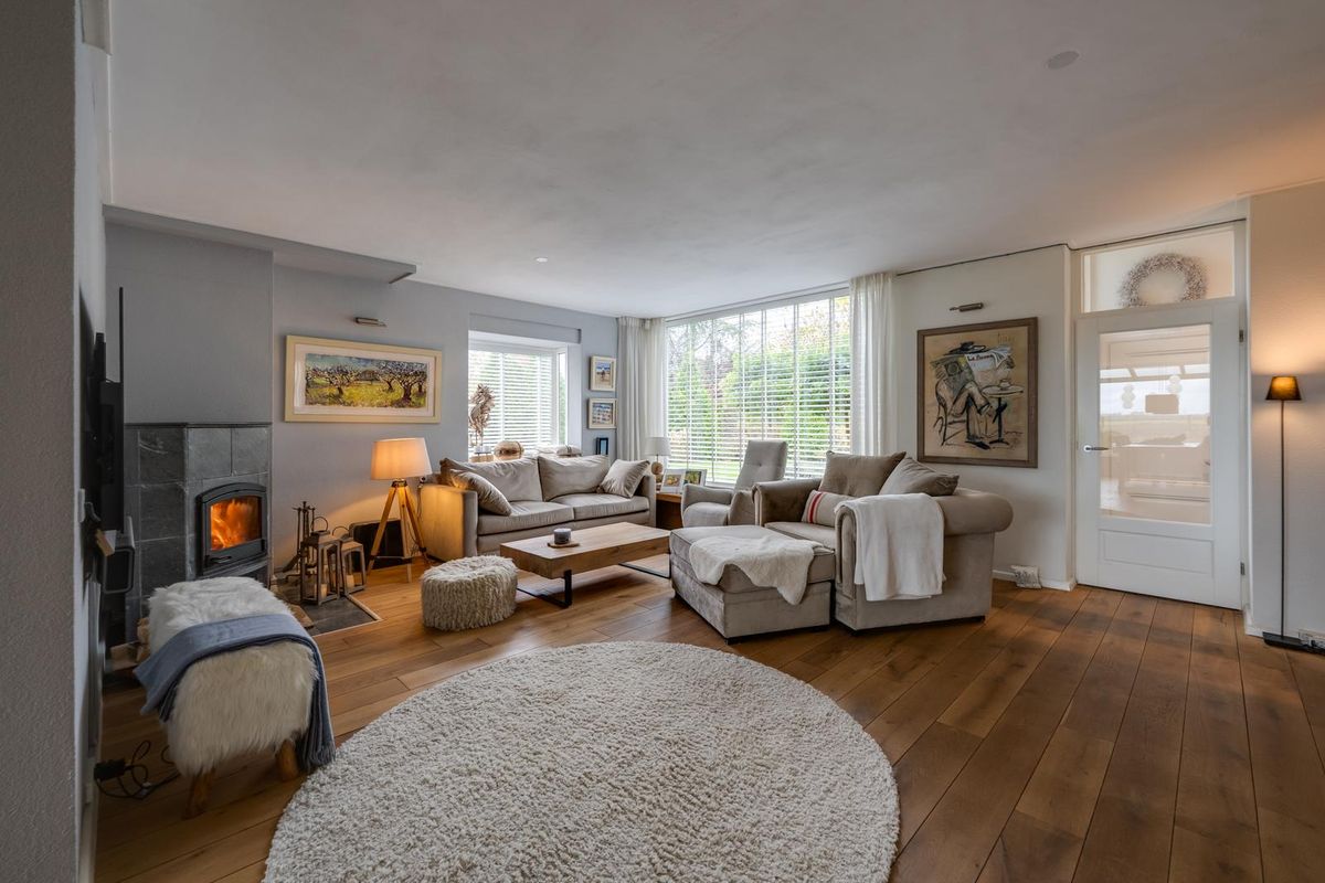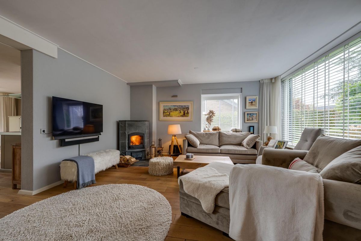De ruime hal met nieuwe meterkast en toilet geeft toegang tot de garage/berging en de woonkamer. De grote raampartijen in de woonkamer zorgen voor een overvloed aan daglicht en een schitterend uitzicht over de groene omgeving. De eikenhouten vloer en de Tulikivi speksteenkachel geven de ruimte een warme, natuurlijke uitstraling.