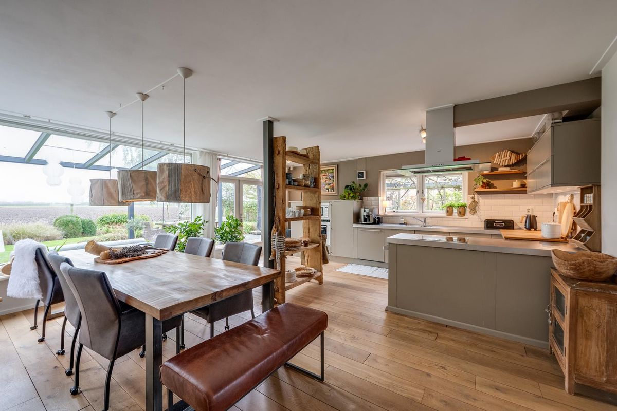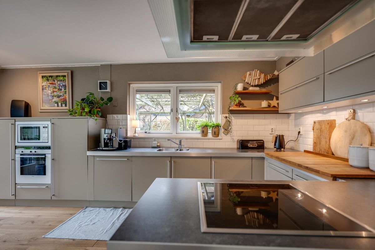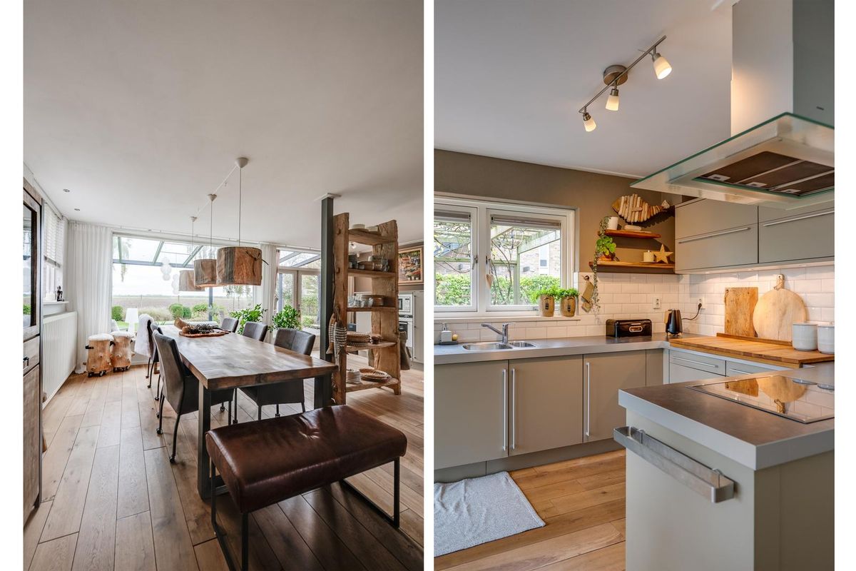 Het eetgedeelte sluit aan op de open keuken en beschikt over openslaande deuren naar de tuin, waardoor binnen en buiten op een prettige manier in elkaar overlopen. De keuken is praktisch ingedeeld, voorzien van diverse inbouwapparatuur, heeft voldoende kastruimte en een royaal werkblad. Vanuit de eetkamer is middels een kleine hal de eerste verdieping te bereiken middels een vaste trap.