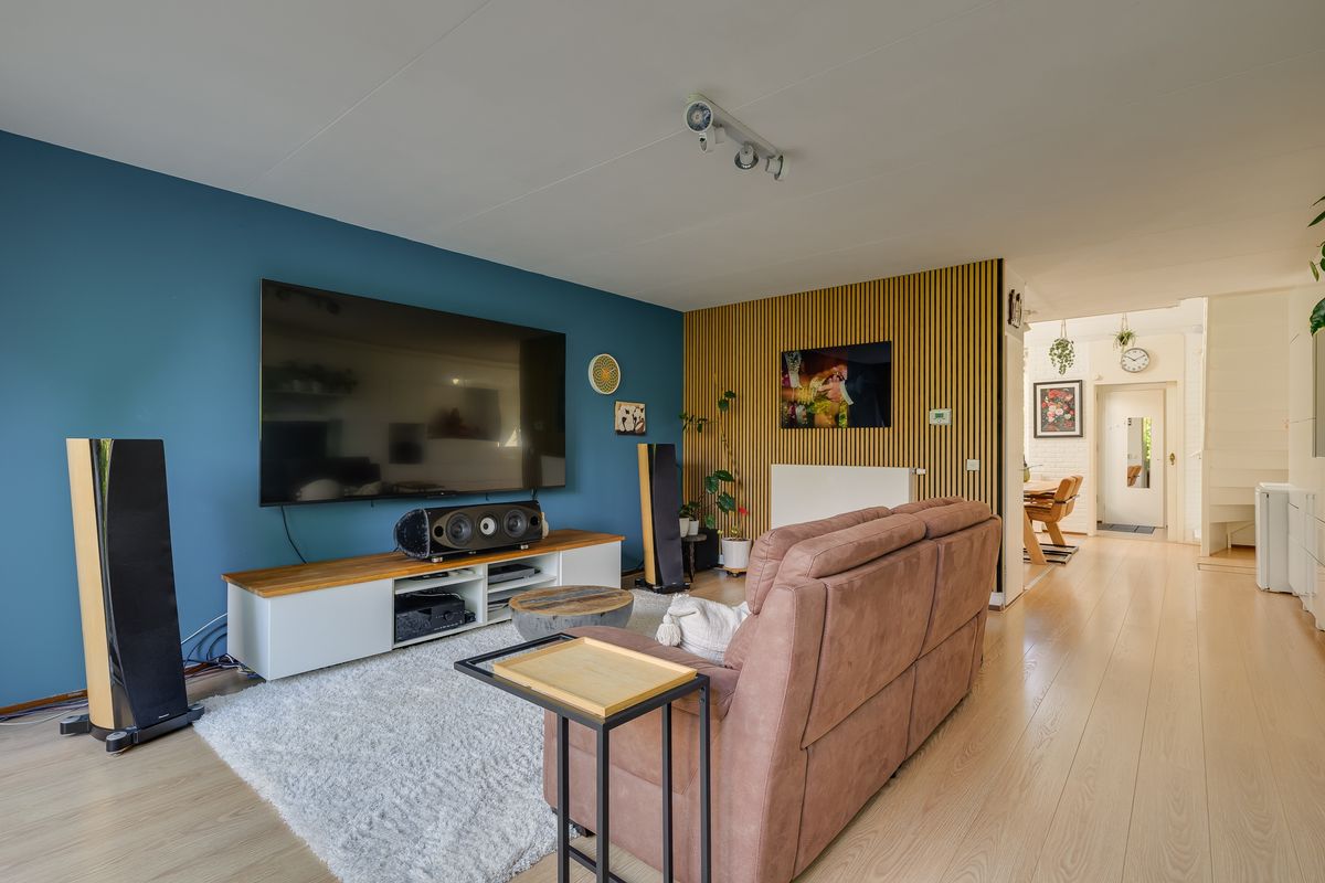 • Licht en luchtig: Royale woonkamer met laminaatvloer en een enorme glazen schuifpui die helemaal open kan. Binnen en buiten lopen hier moeiteloos in elkaar over.