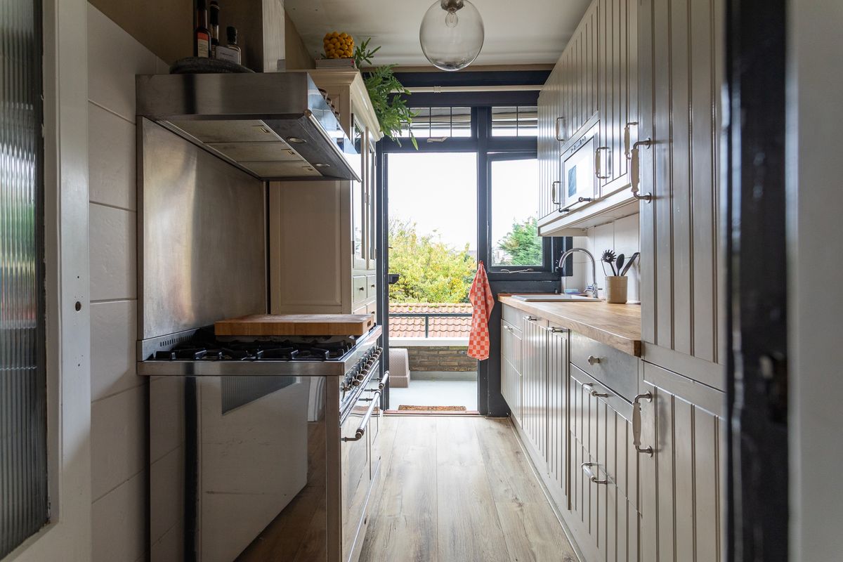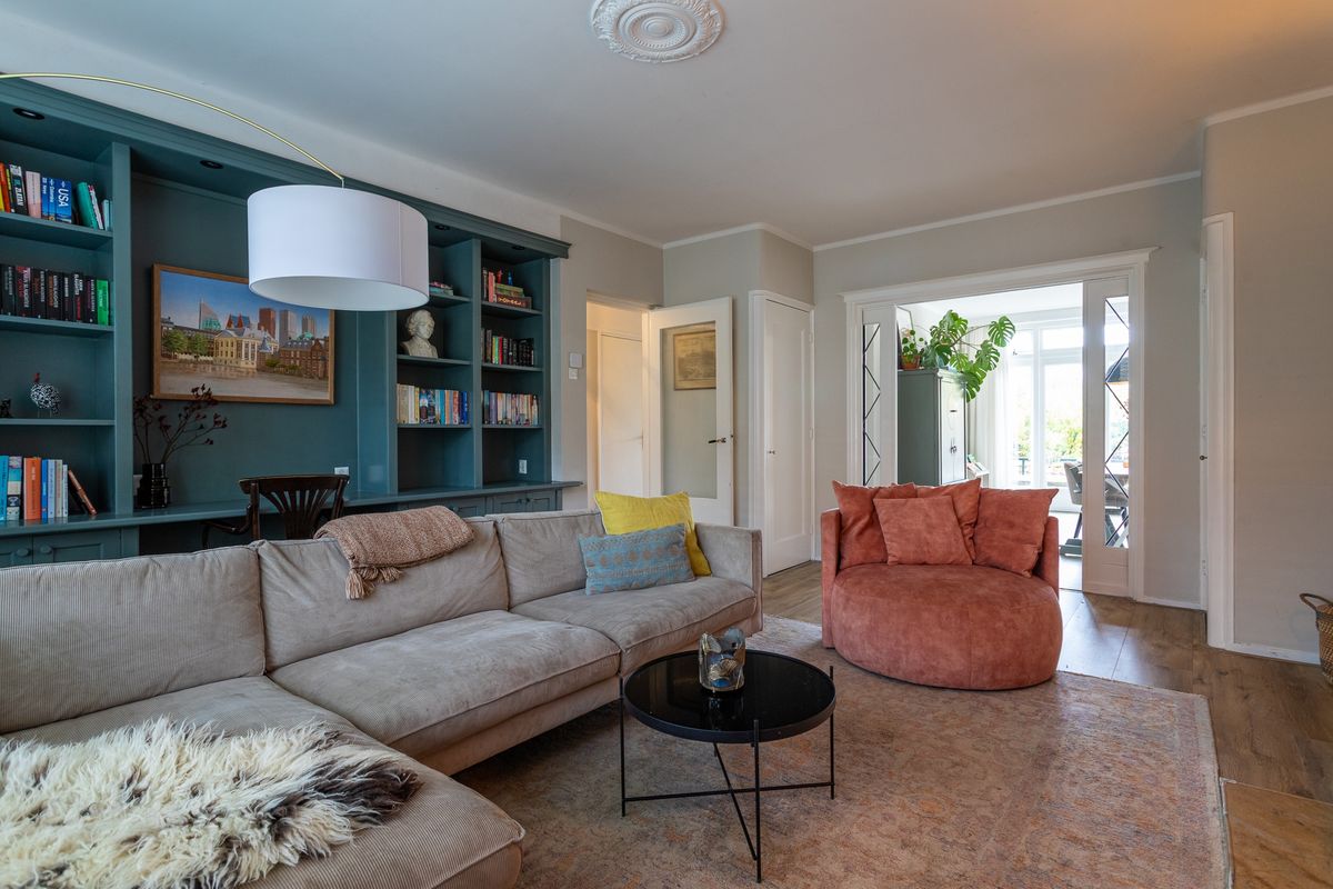 Gesloten portiek met brievenbussen- en bellentableau, entree appartement op de eerste verdieping. Na binnenkomst L-vormige hal met toilet, die toegang biedt tot alle vertrekken. Ruime en lichte woonkamer en suite, voorzien van de klassieke schuifseparatie met glas in lood en vier vaste kasten. Aan de voorzijde vind je het gezellige zitgedeelte met houtkachel en recent geplaatste inbouwkast. Aan de achterzijde bevindt zich het eetgedeelte met openslaande deuren naar het zonnige balkon. Het balkon is gelegen op het zuidwesten, heeft heerlijk vrij uitzicht, heeft over de volledige breedte een diepte van 1,40m en beschikt over een balkonkast.