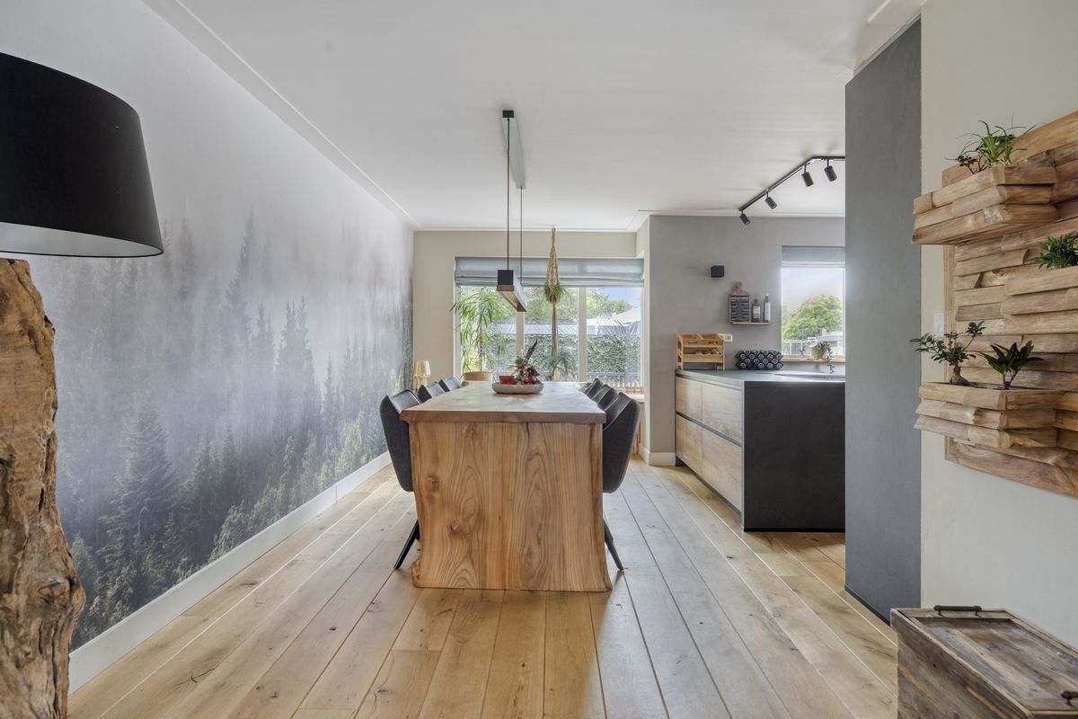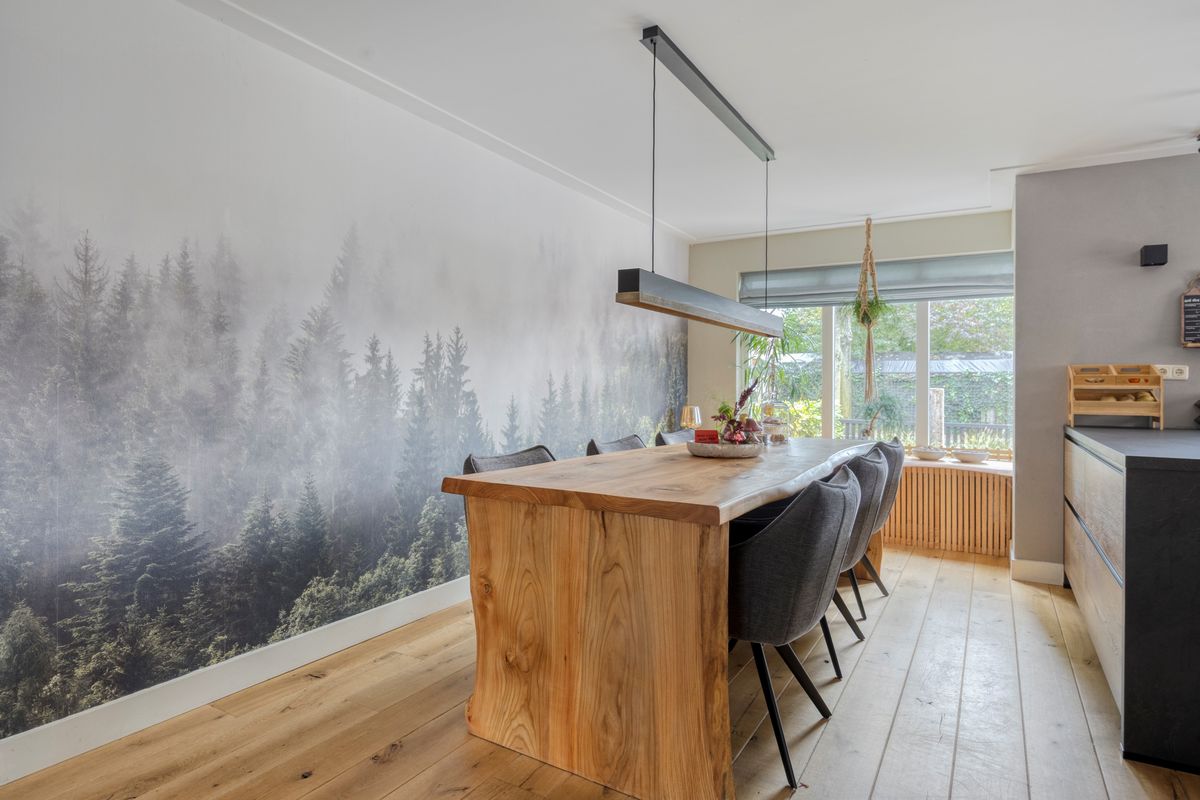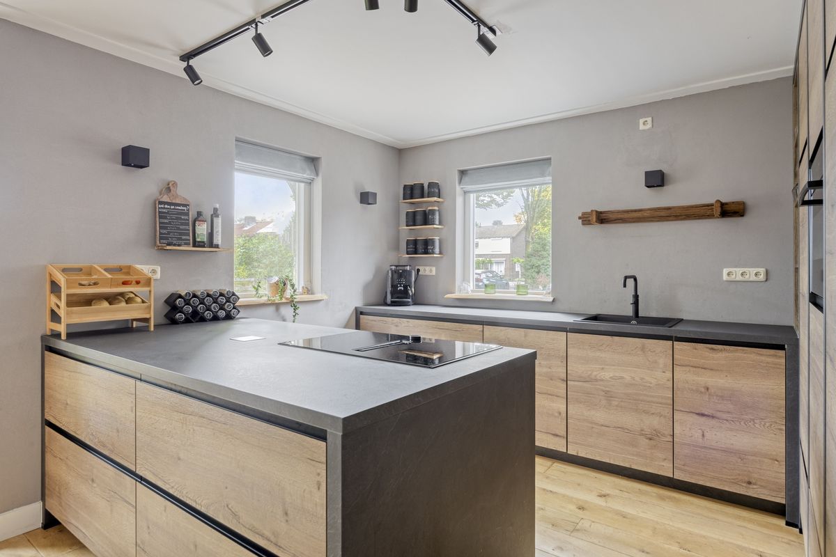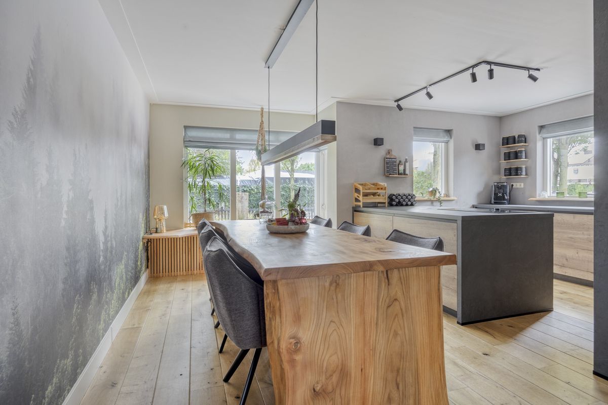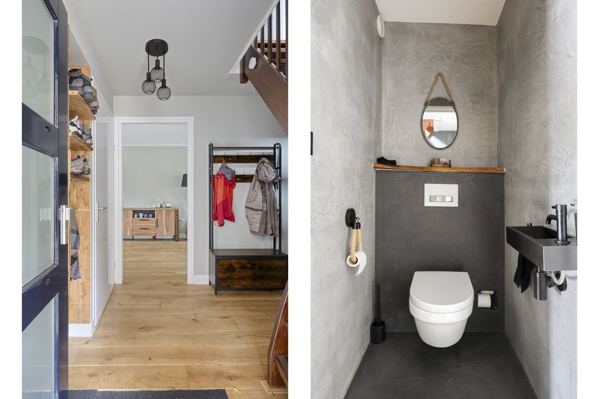 Je komt binnen in de hal met garderoberuimte en trapopgang. Vanuit hier zijn de woonkamer, de garage en het toilet bereikbaar. De toiletruimte is afgewerkt met een zwevend toilet en een fonteintje. De uitgebouwde L-vormige woonkamer is verrassend ruim en sfeervol ingedeeld, met een haardpartij inclusief schouw en openslaande deuren naar het terras. Dankzij de uitbouw geniet je van extra leefruimte en veel lichtinval. Aan de voorzijde ligt de eetkeuken, die in 2023 volledig is vernieuwd met een stijlvolle inbouwkeuken voorzien van moderne apparatuur en veel kast- en werkruimte. De inpandige garage is netjes afgewerkt, voorzien van vloerverwarming, een praktische inbouwkast en een elektrisch bedienbare garagedeur. Dankzij de directe doorgang naar de woning is dit een ideale multifunctionele ruimte, bijvoorbeeld als hobby- of kantoorruimte.