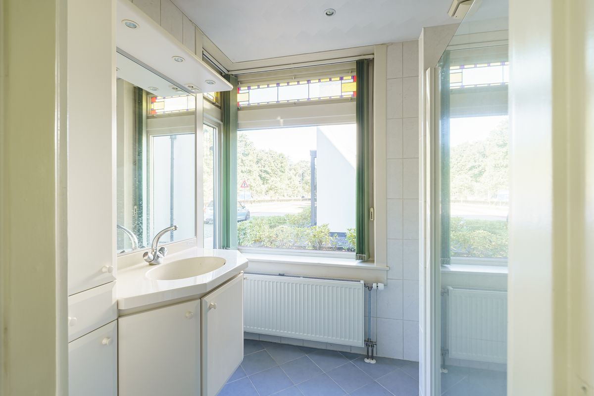 De entree van de woning is aan de zijkant, waar je eerst in de vestibule en vervolgens in de hal met toilet en trapopgang komt. De woonkamer met erker aan de voorzijde is ruim en licht, met een fijne verbinding naar de achtertuin. De open keuken in L-opstelling sluit hier op aan. Aangrenzend aan de woonkamer is aan de voorzijde een (slaap)kamer met een eigen badkamer (douche, toilet en wastafel).