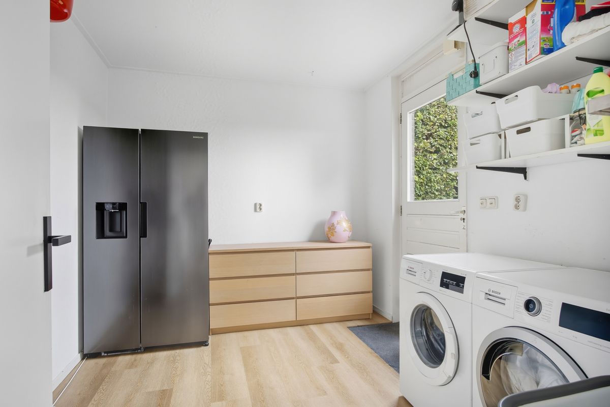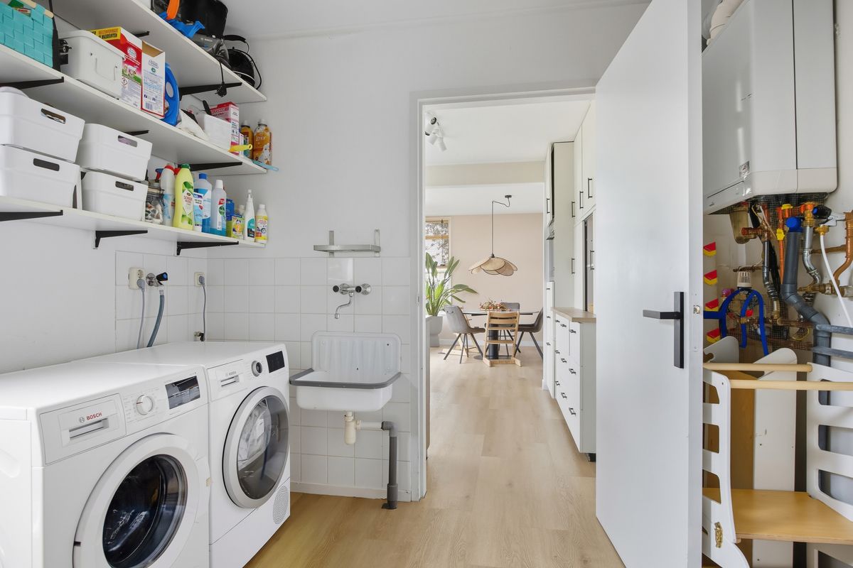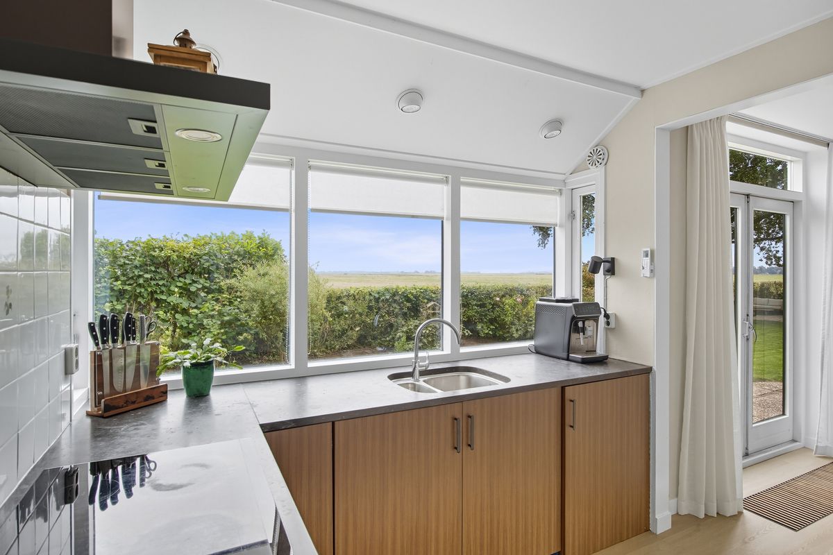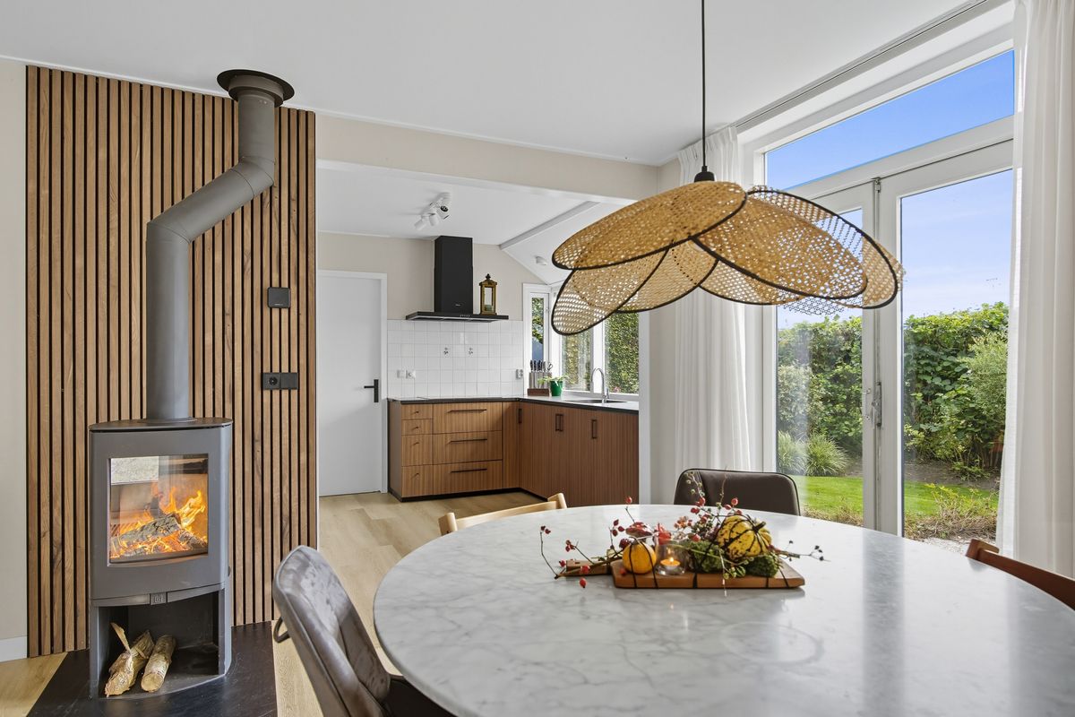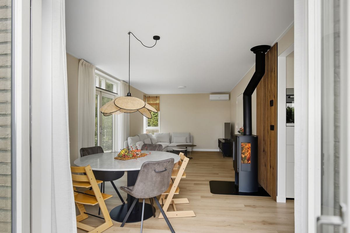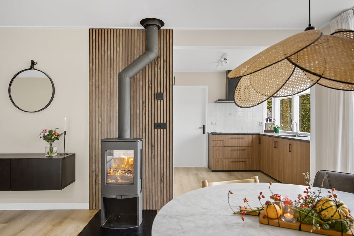 Entree, hal met meterkast en trapopgang. De ruime woonkamer is heerlijk licht met grote raampartijen en openslaande deuren naar het terras van de achtertuin. De robuuste houtkachel zorgt voor extra warmte op de koudere dagen en de airco voor koelte in de zomer. De halfopen keuken heeft een hoekkeuken en een grote wandkast, beide voorzien van inbouwapparatuur. Door de ramen boven het werkblad is er mooi zicht op de tuin en de achtergelegen weilanden. De bijkeuken met wasbakje heeft flinke afmetingen en voldoende ruimte voor witgoedaansluitingen, de cv-installatie en bergkasten. Via een tuindeur is er toegang naar de achtertuin.