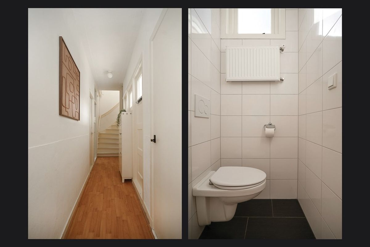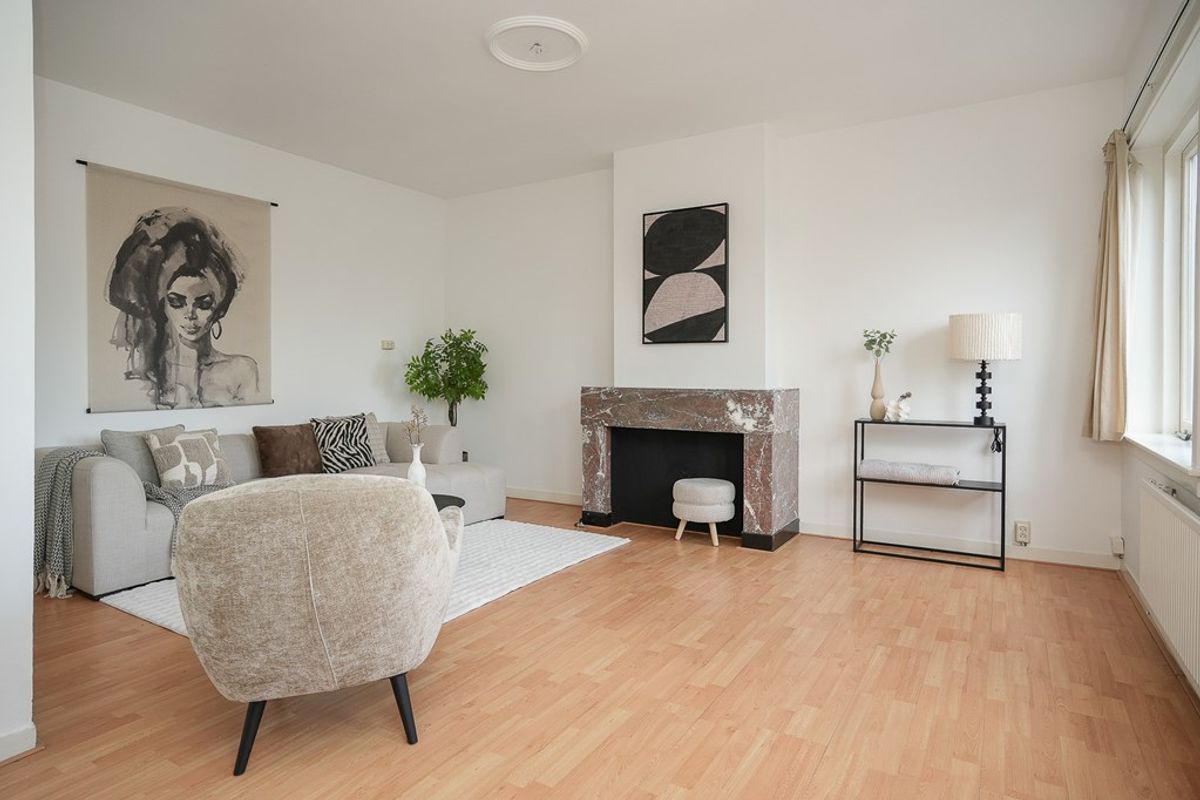 Via de prettige trap bereik je de hal op de 1-ste verdieping. Deze biedt toegang tot het balkon aan de achterzijde van de woning, het toilet, de keuken en de woonkamer. De woonkamer is ruim en licht door de grote raampartijen. De ruimte is in te delen met een comfortabele zithoek en een gezellige eethoek. In de woonkamer bevindt zich een tevens een klassieke schouw.
