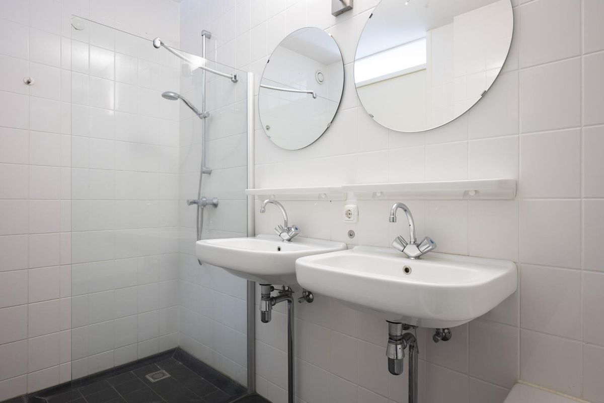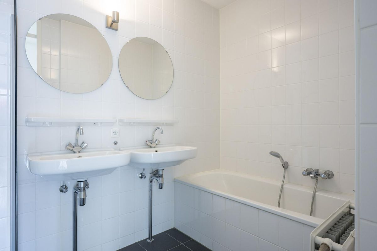 - Volledig betegelde badkamer (ca. 5,5 m²) v.v. dubbele wastafel met spiegel en planchet, inloopdouche met hardglazen deur, ligbad, afzuiging en radiator;
