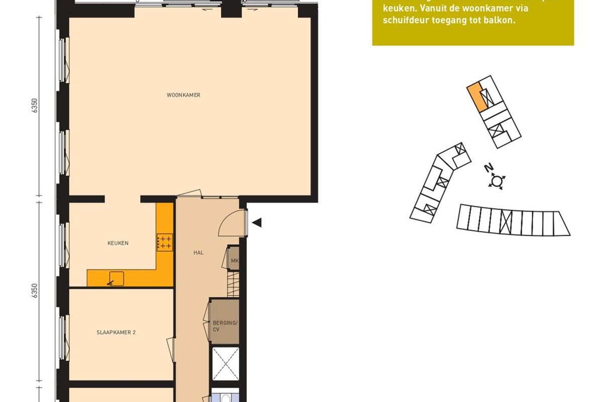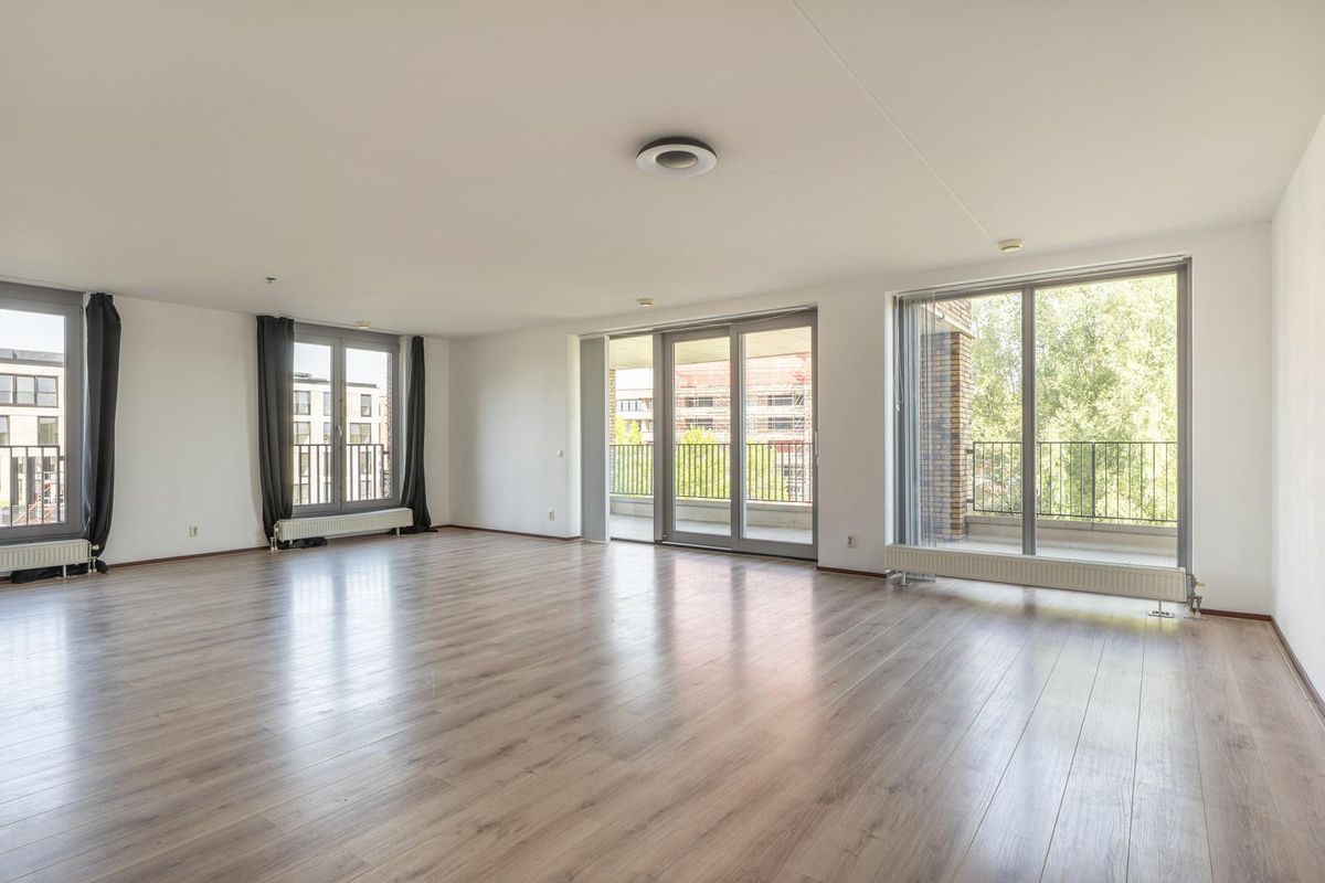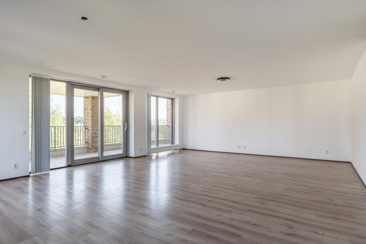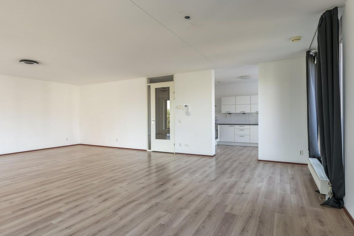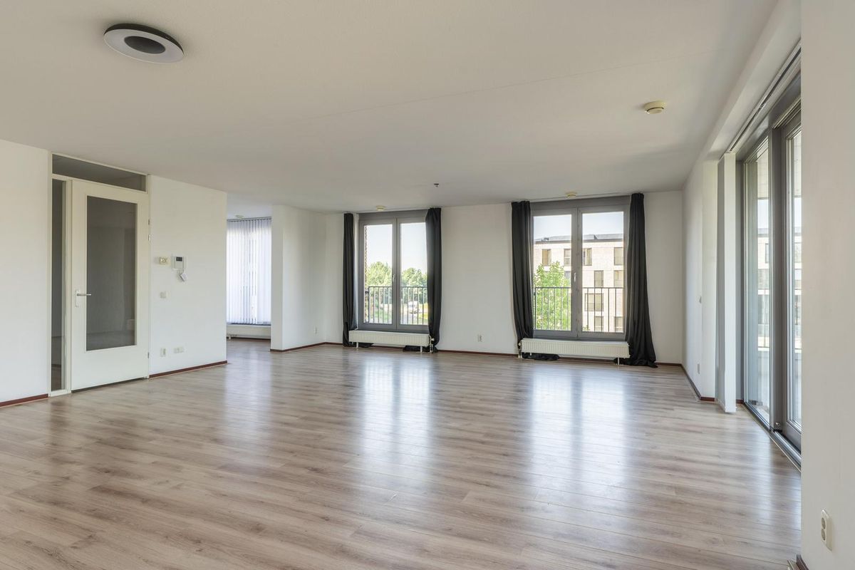 - Woonkamer met balkon (ca. 29 m²) en ramen aan twee kanten, met doorloop naar de ruime keuken;