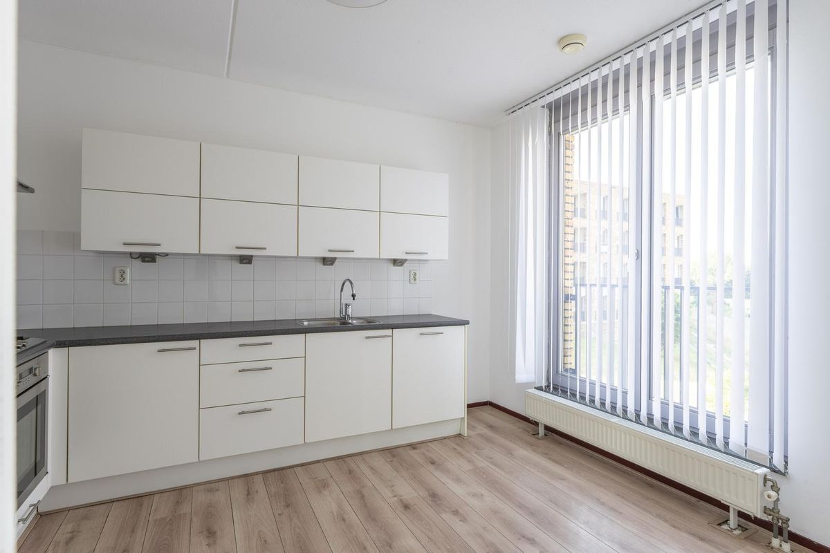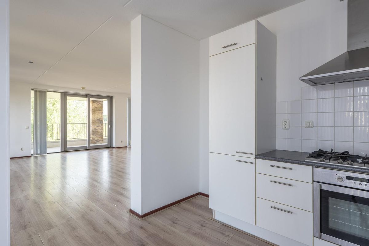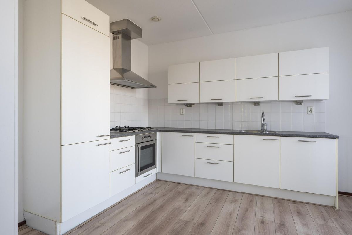 - Open keuken, voorzien van rechte witte keukenopstelling met onder- en bovenkasten, hardkunststof werkblad, gaskookplaat, elektrische oven, inbouw koel-/vriescombinatie en afzuigkap;