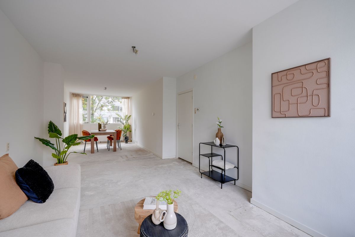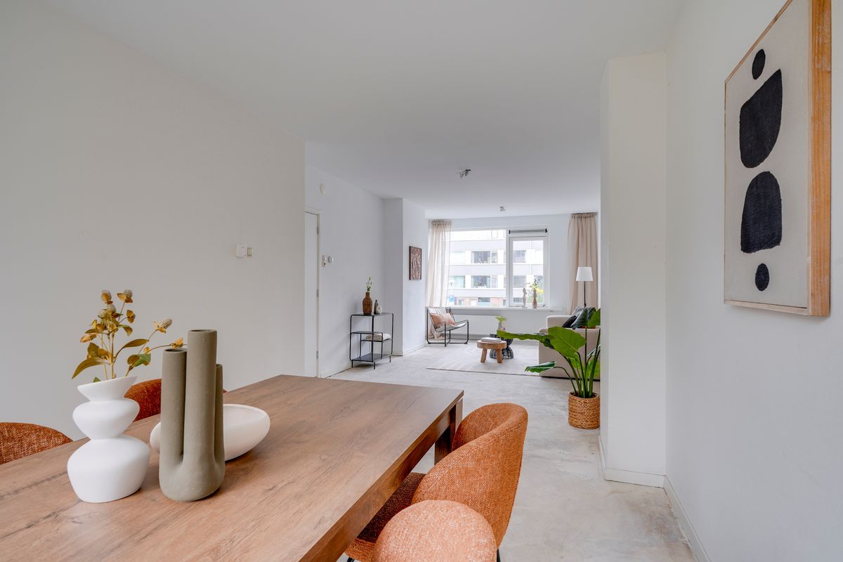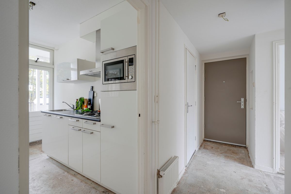 De hal geeft toegang tot alle vertrekken, waardoor de indeling overzichtelijk en efficiënt is. De doorzonwoonkamer zorgt voor een fijne hoeveelheid daglicht en biedt volop ruimte om naar eigen smaak in te inrichten. De aparte keuken is uitgerust met diverse inbouwapparatuur en geeft toegang tot het balkon aan de achterzijde. Er zijn twee slaapkamers, waarvan één directe toegang heeft tot het balkon aan de voorzijde. De badkamer is netjes afgewerkt en voorzien van een inloopdouche, wastafel en toilet, met een raam voor natuurlijke ventilatie.