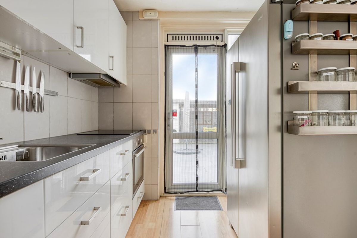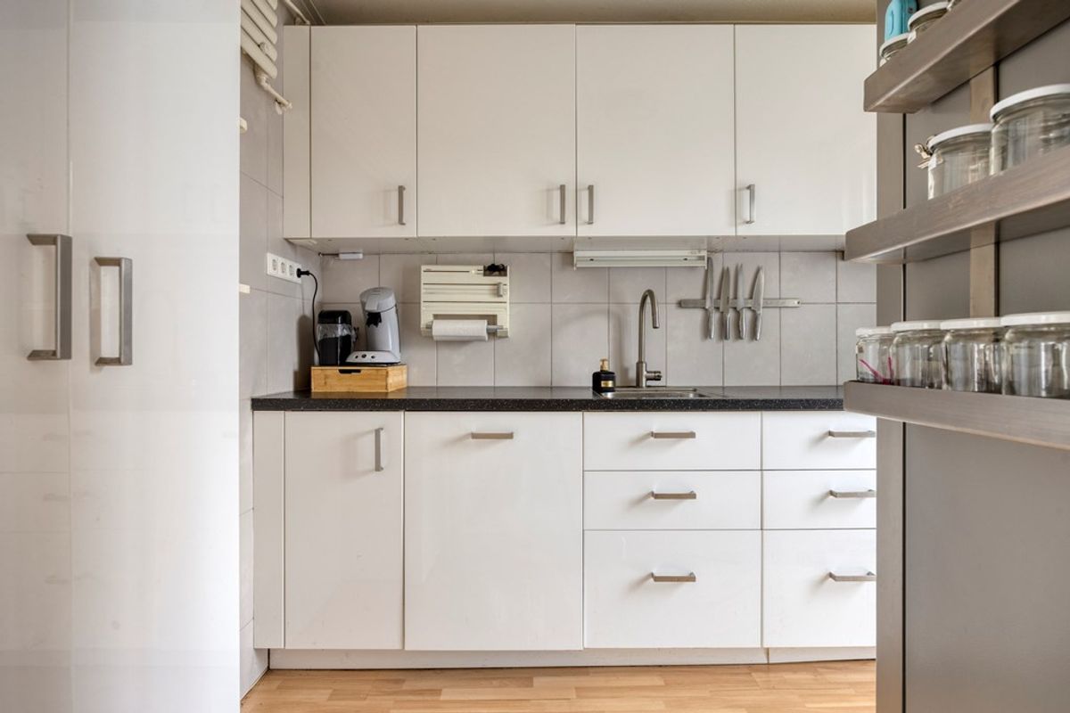 De moderne keuken (ca. 6,9 m²) sluit aan op de eetkamer en is uitgevoerd in wit met een zwart werkblad, voorzien van inductiekookplaat, oven, vaatwasser en een vrijstaande koel-vriescombinatie.
