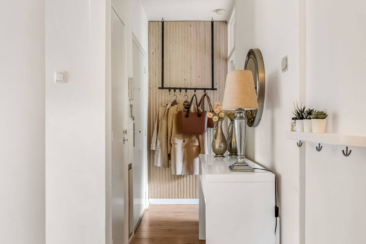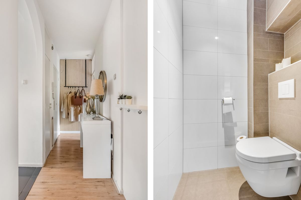 Het appartement zelf is gelegen op de eerste verdieping. Bij binnenkomst heeft u direct toegang tot alle ruimtes via de hal die voorzien is van een mooie houten laminaatvloer.
