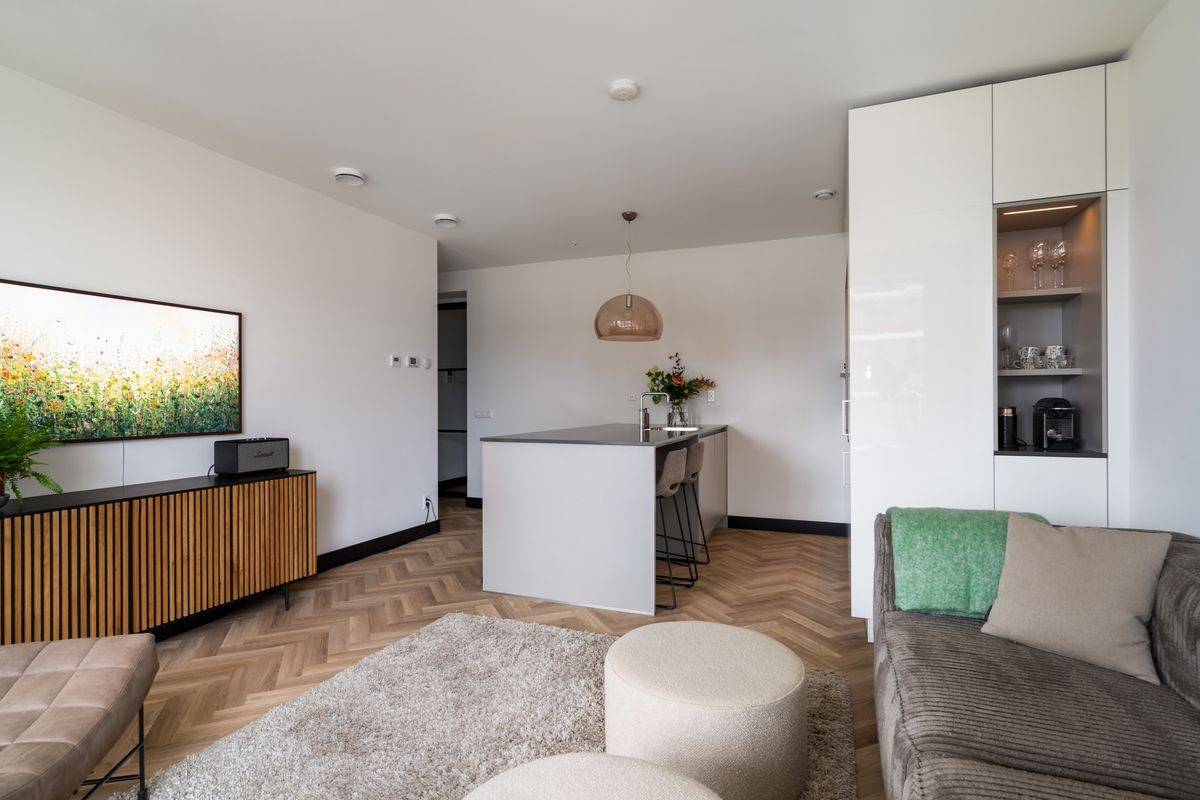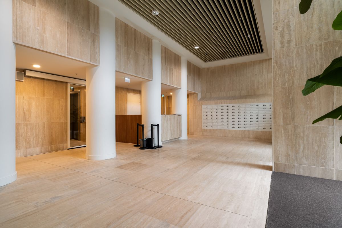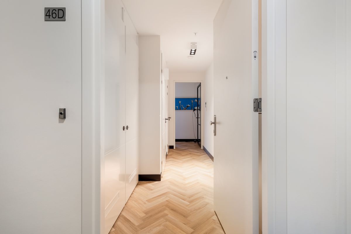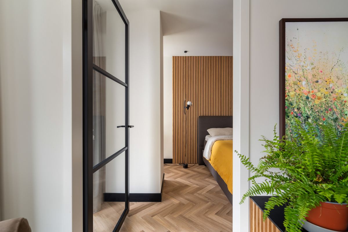 De ruimte is afgewerkt met luxe binnendeuren en strakke kozijnen, voorzien van zwart deurbeslag – een detail dat de moderne uitstraling van het appartement versterkt.