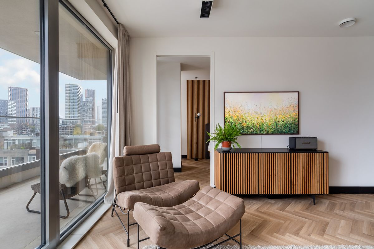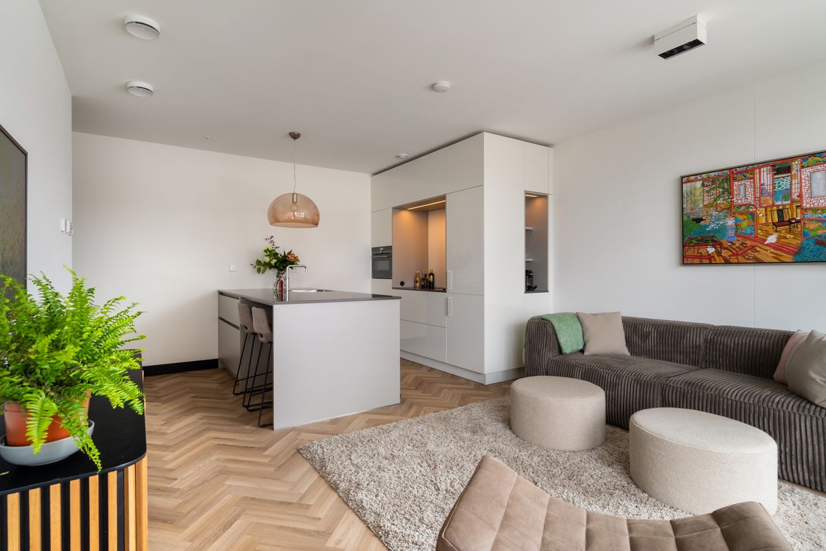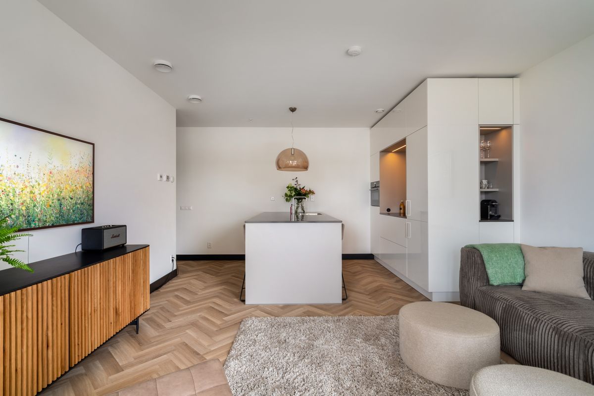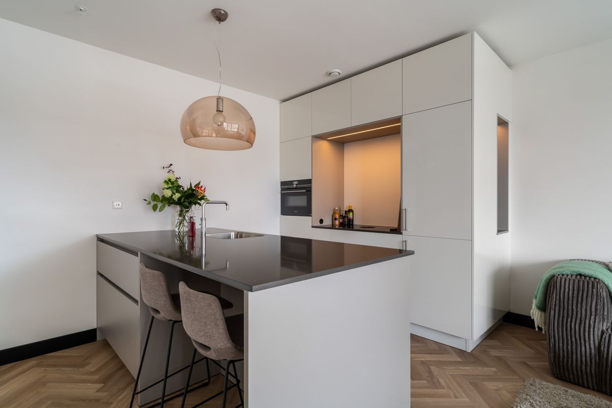 De ruimte is afgewerkt met luxe binnendeuren en strakke kozijnen, voorzien van zwart deurbeslag – een detail dat de moderne uitstraling van het appartement versterkt.