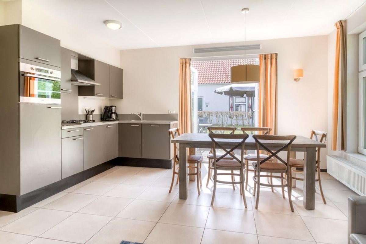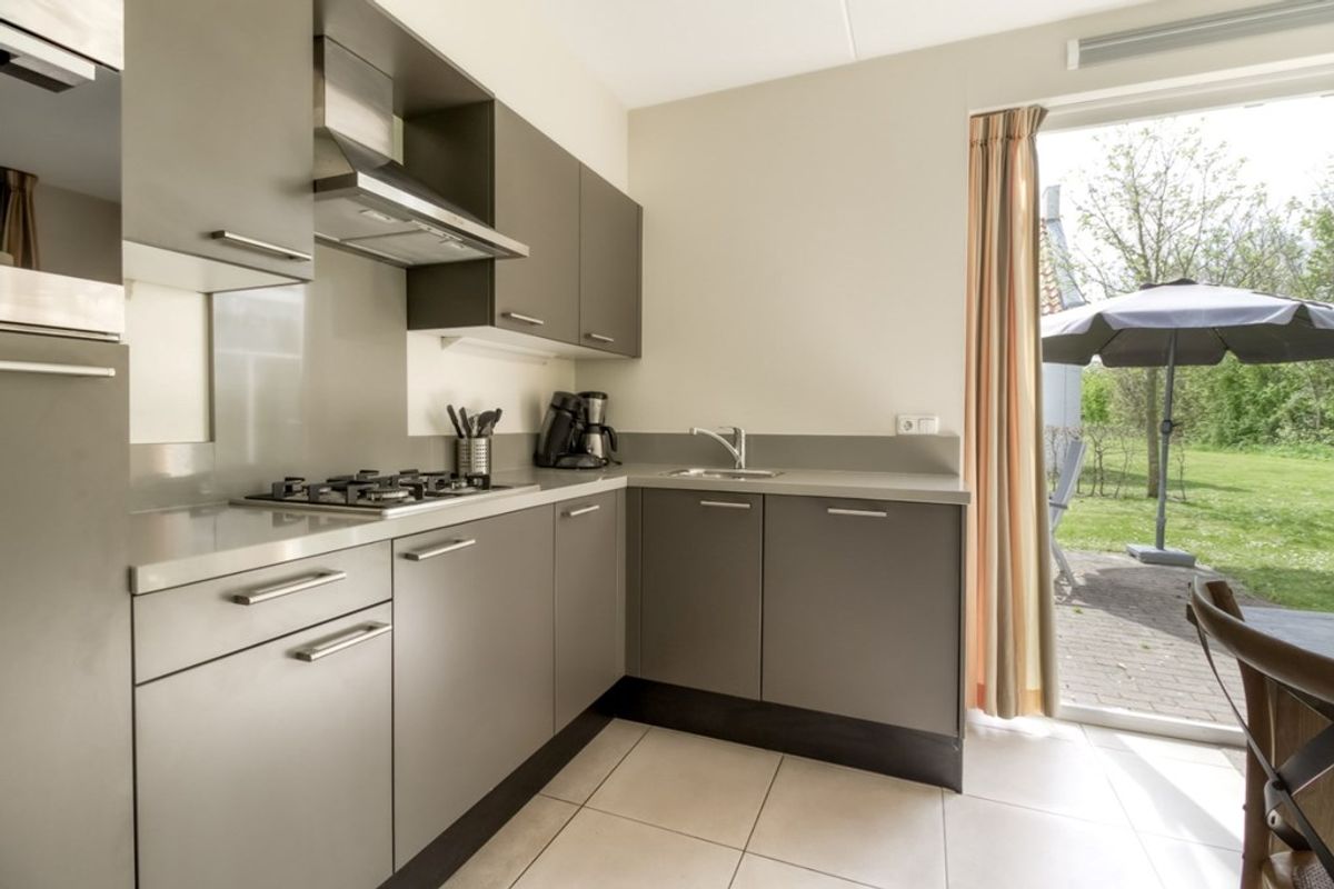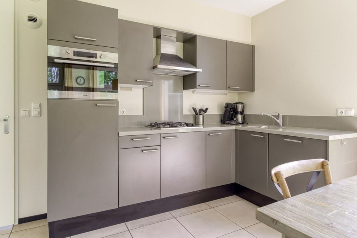 De keuken is voorzien van alle nodige inbouw-apparatuur en bestaat uit; 4-pits gas- kookplaat, afzuigkap, spoelbak, combi- magnetron, koelkast met vriesvak en vaatwasmachine. Er zijn dubbele openslaande deuren naar het terras en de tuin.
