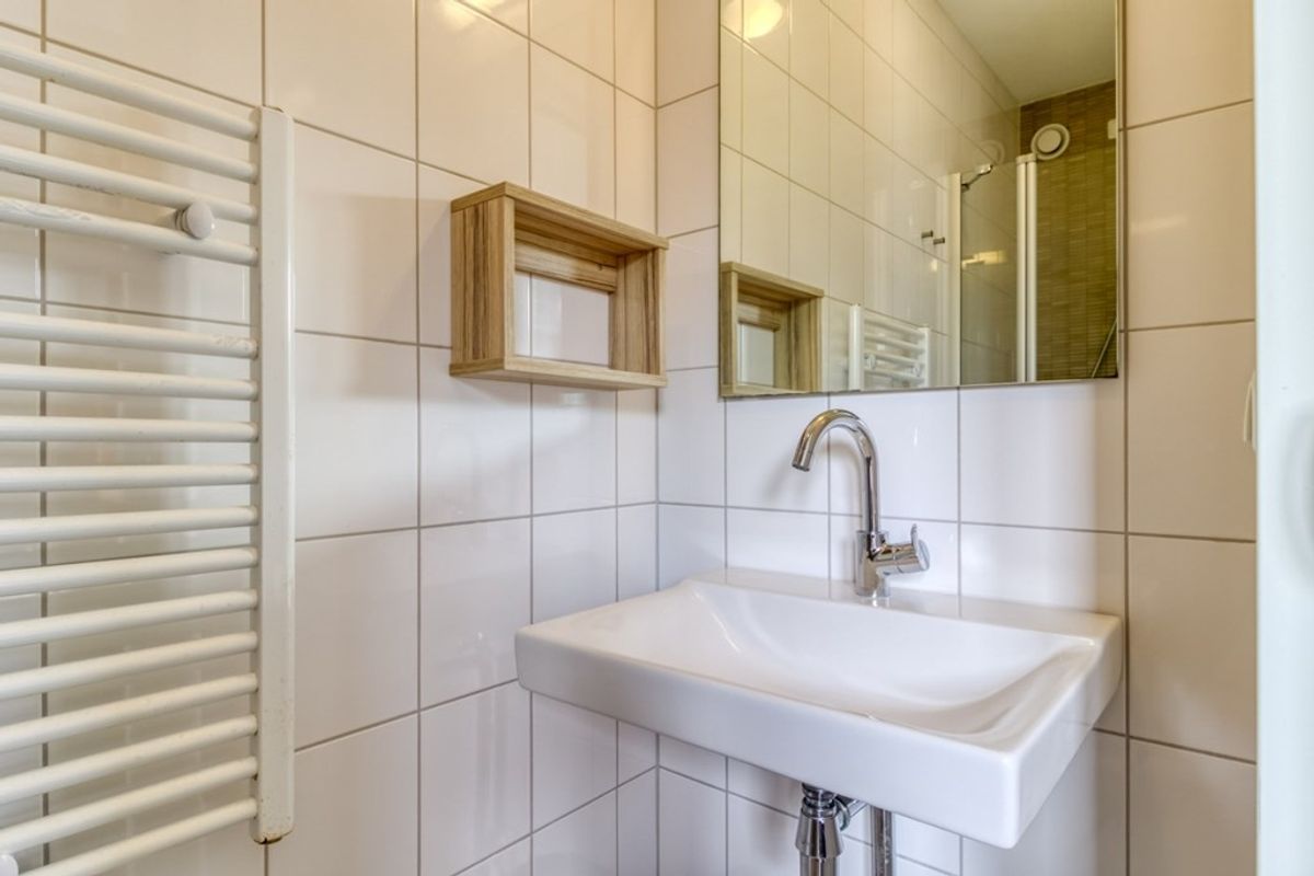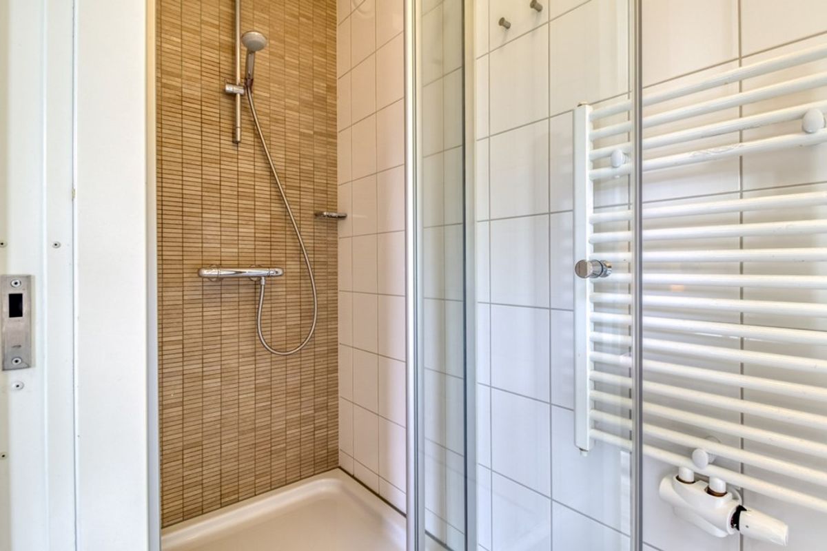 Deze badkamer is uitgerust met een douche, wastafel en een handdoekradiator.