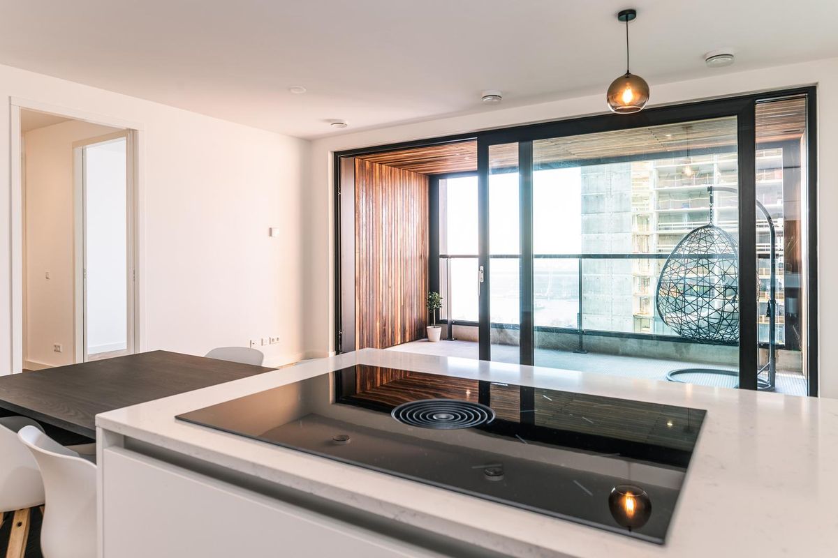 De lichte woonkamer met open keuken biedt volop ruimte voor ontspanning én gezelligheid, met een praktische bar aan de keuken. De moderne, luxe keuken is voorzien van alle gemakken, waaronder een BORA-afzuigsysteem en een Quooker. Via de schuifpui bereikt u het zonnige balkon van ca. 11 m², gelegen op het zuidwesten, waar u kunt genieten van de zon én het panoramische uitzicht.