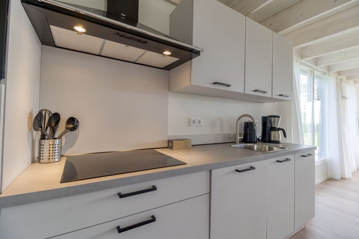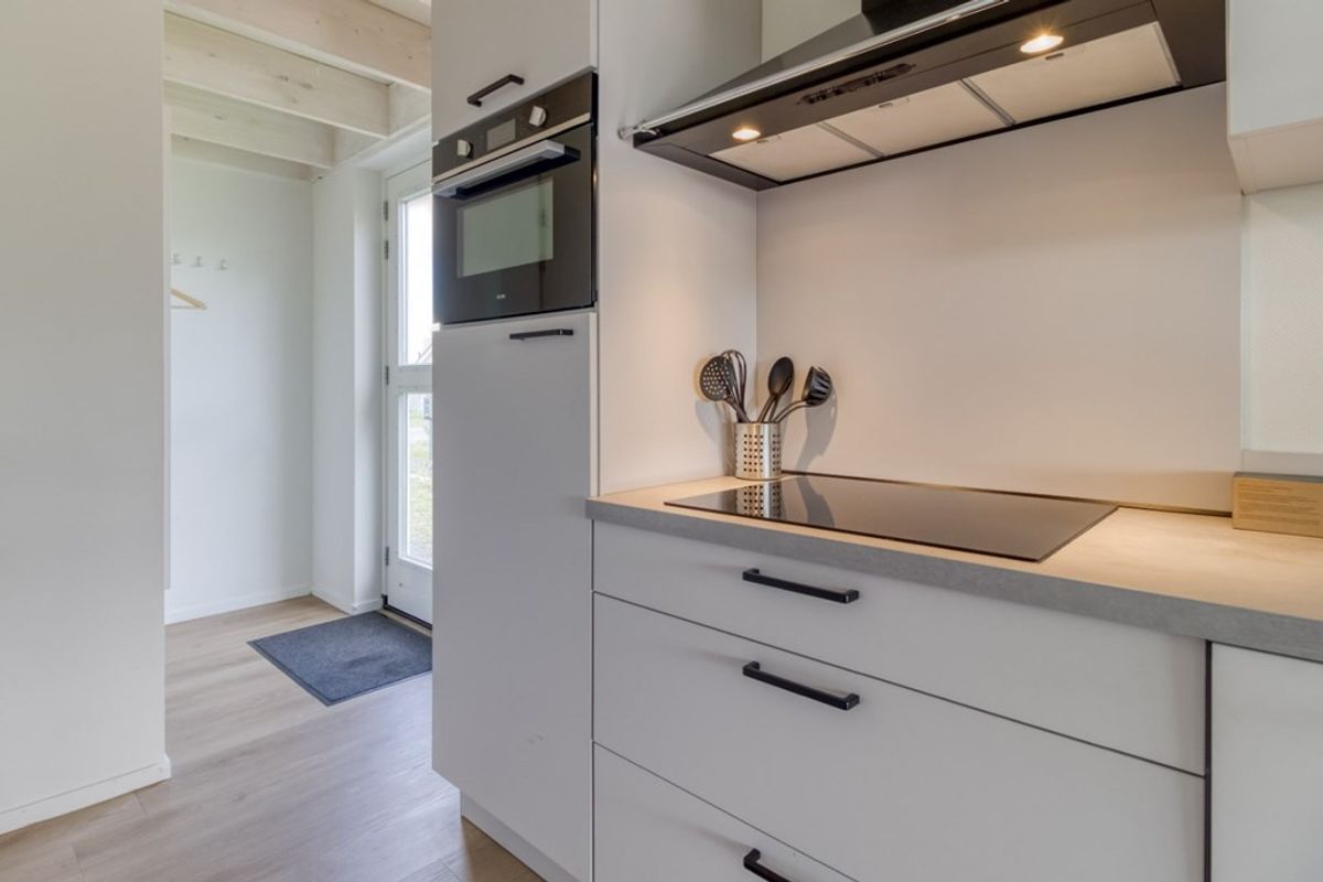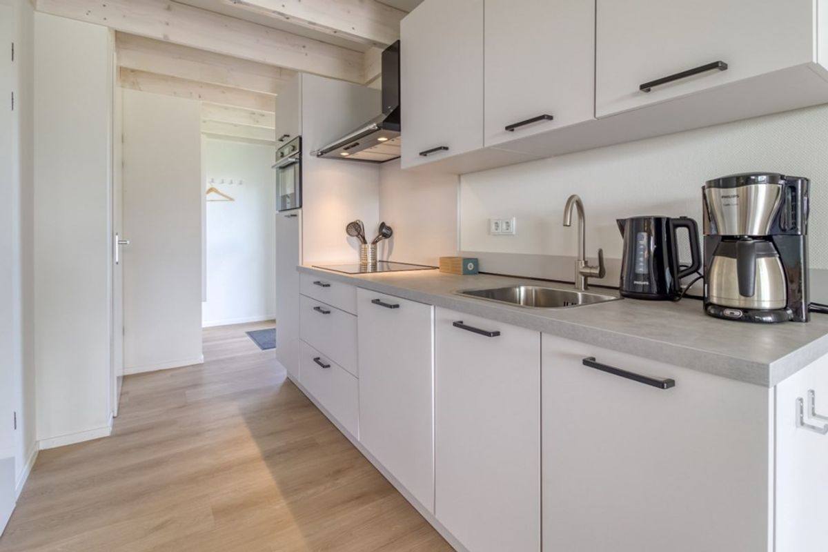 U komt binnen in de hal van waar uit alle ruimtes op de begane grond te bereiken zijn. De woonkamer heeft veel lichtinval door de hoge raampartijen en hierdoor heeft u ook een prachtig uitzicht. Via de grote schuifdeur komt u op het overdekte terras (veranda) en in de tuin. Naast de zithoek is er een eethoek en een open keuken die doorloopt in de hal. De keuken is voorzien van alle nodige inbouw-apparatuur en bestaat uit; 4-pits inductie kookplaat, afzuigkap, combi- magnetron, koelkast met vriesvak, spoelbak en vaatwasmachine. Er is op de begane grond 1 slaapkamer en ook de badkamer bevindt zich hier. De badkamer is voorzien van inloopdouche, wastafel en toilet. Tevens is er een berging waar zich de technische installaties bevinden en waar er plaats is voor huishoudelijke spullen.