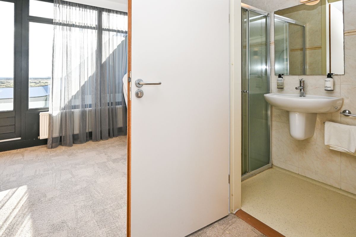 Family Suite 208 is een ruime maisonnette, verdeeld over de tweede en derde verdieping, en biedt met haar circa 90 m² een bijzonder comfortabel verblijf. Vanuit de suite geniet je van een panoramisch uitzicht over de duinen, het strand en de Noordzee. Deze maisonnette beslaat de volledige breedte van het hotel, wat zorgt voor een lichte, royale leefruimte met meerdere balkons aan zowel de noord- als de zuidzijde, samen goed voor circa 33 m² aan buitenruimte. Daarnaast beschikt de maisonnette over een eigen ruime garagebox en een extra berging in de kelder, ideaal voor opslag en het parkeren van de auto.