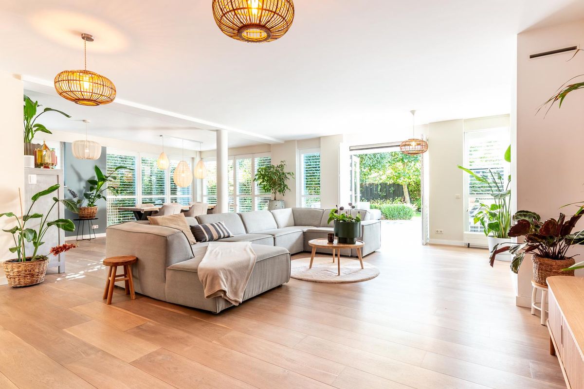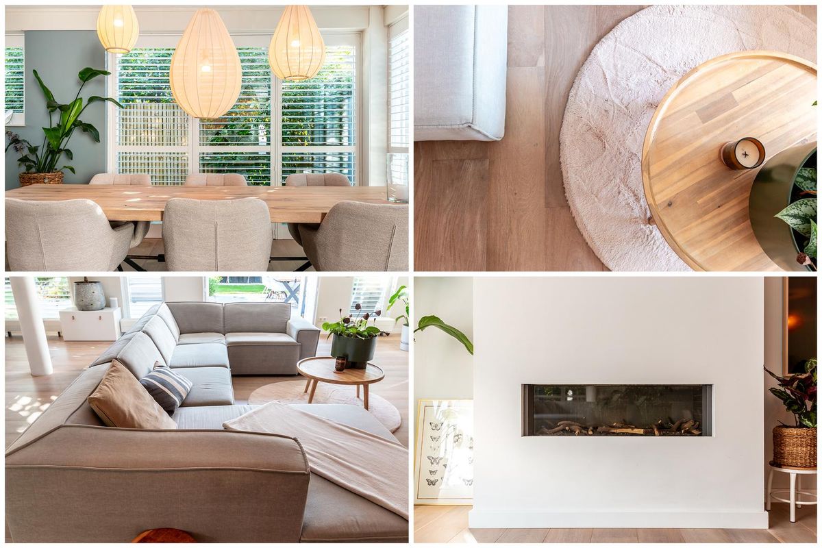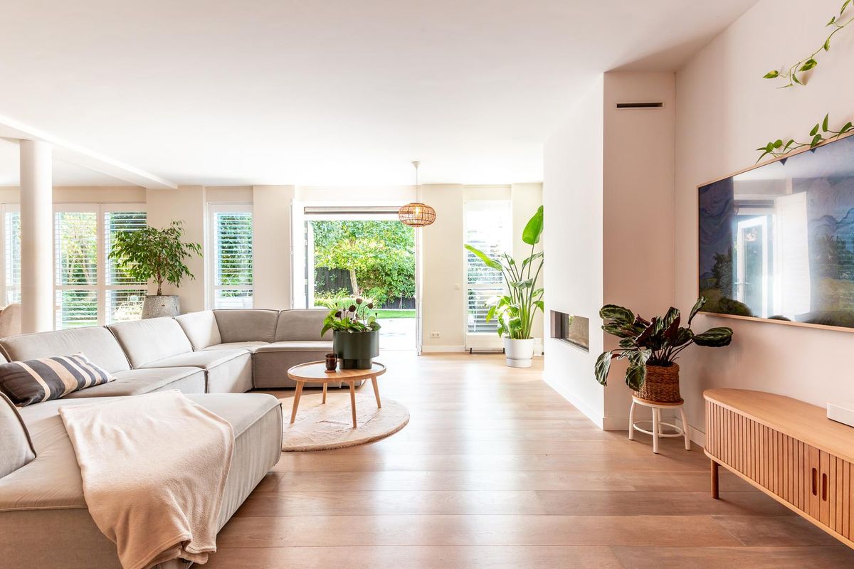 Deze ruimte laat zich eigenlijk niet in woorden vangen — maar als we er één moeten kiezen: “wauw”. Wat een zee van licht, ruimte en gezelligheid! Het eerste dat opvalt is het uitzicht op de tuin en de luxe afwerking. Door de vele raampartijen lijkt het alsof de tuin een verlengstuk is van de woonkamer. De vernieuwde vloer, dubbele tuindeuren, strak stucwerk en de haard maken het plaatje compleet.