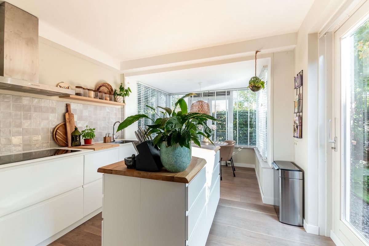 Aan de voorzijde van de woning bevindt zich de woonkeuken. Volledig vernieuwd in 2019 en voorzien van alle gemakken, waaronder een Quooker heetwaterkraan, vaatwasser, combi-oven/magnetron en een los werkeiland. Ook hier geven dubbele tuindeuren toegang tot de zijtuin.