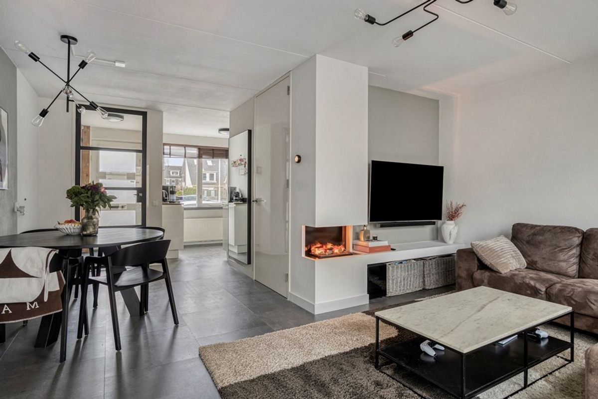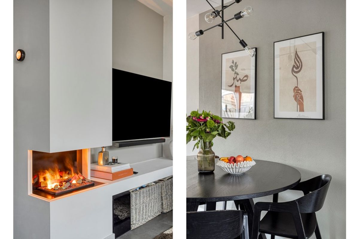 Tuingerichte woonkamer met gezellige haard (op stoom), deur naar de tuin en laminaatvloerafwerking