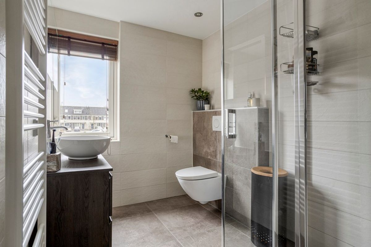 Moderne badkamer met douchecabine vv stortdouche, 2e toilet en wastafelmeubel.