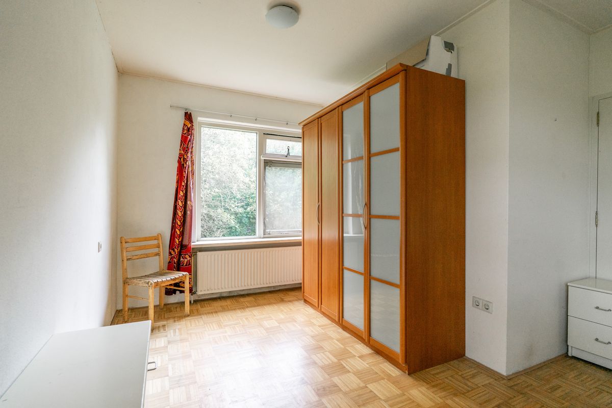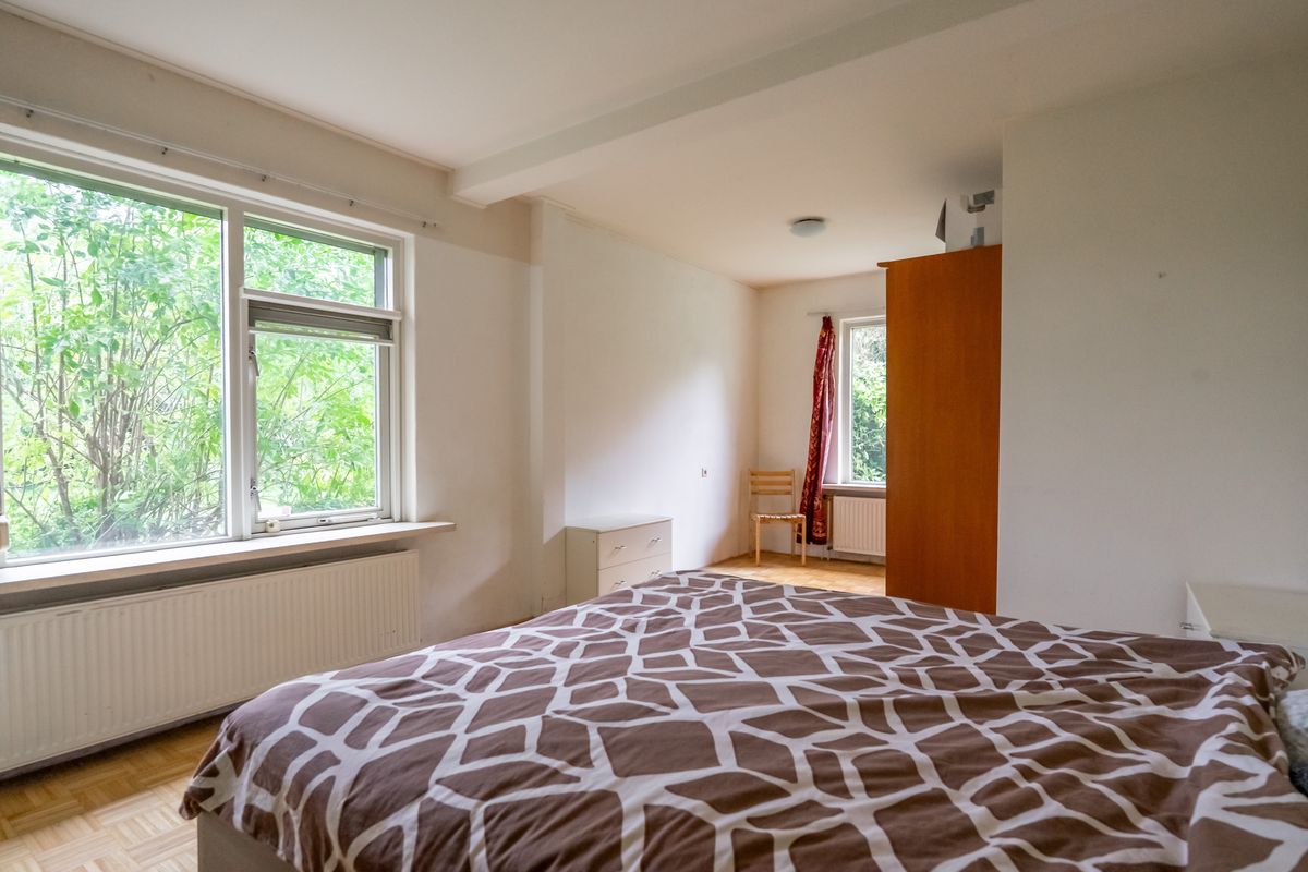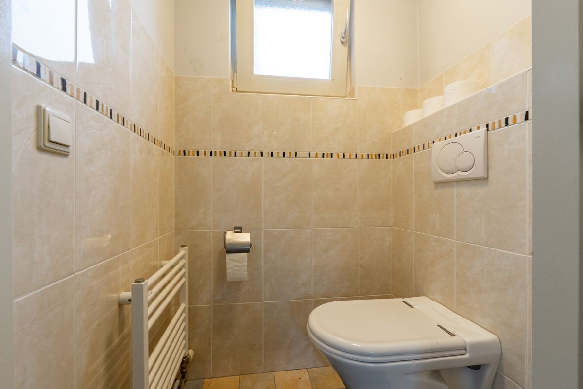 Aangrenzend ligt een tussenhal met achteringang en toiletruimte. In het achterhuis bevindt zich de hoofdslaapkamer met badkamer en suite – ideaal voor gelijkvloers wonen. Daarnaast is er een werkkamer met dubbele tuindeuren, bergzolder en toegang tot de bijkeuken/wasruimte en garage.