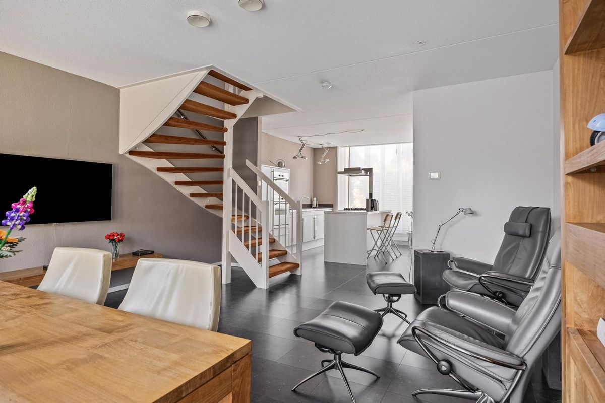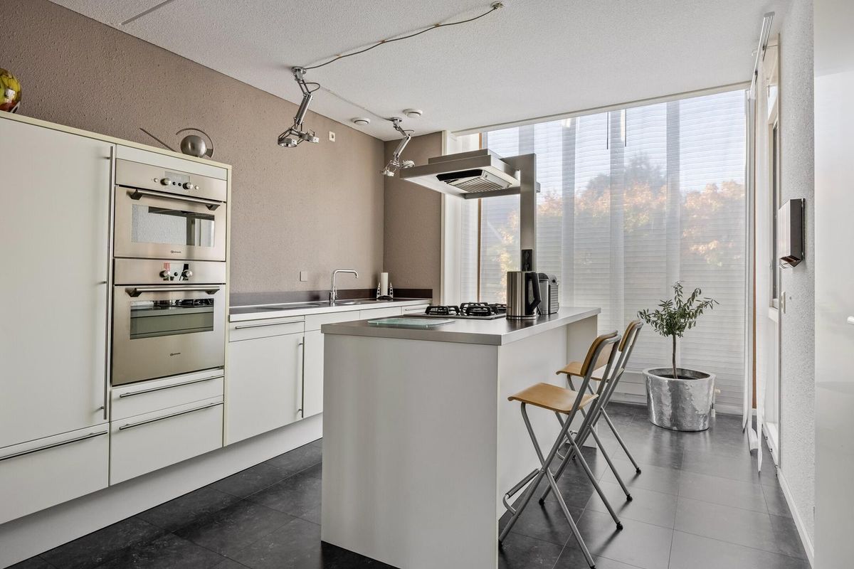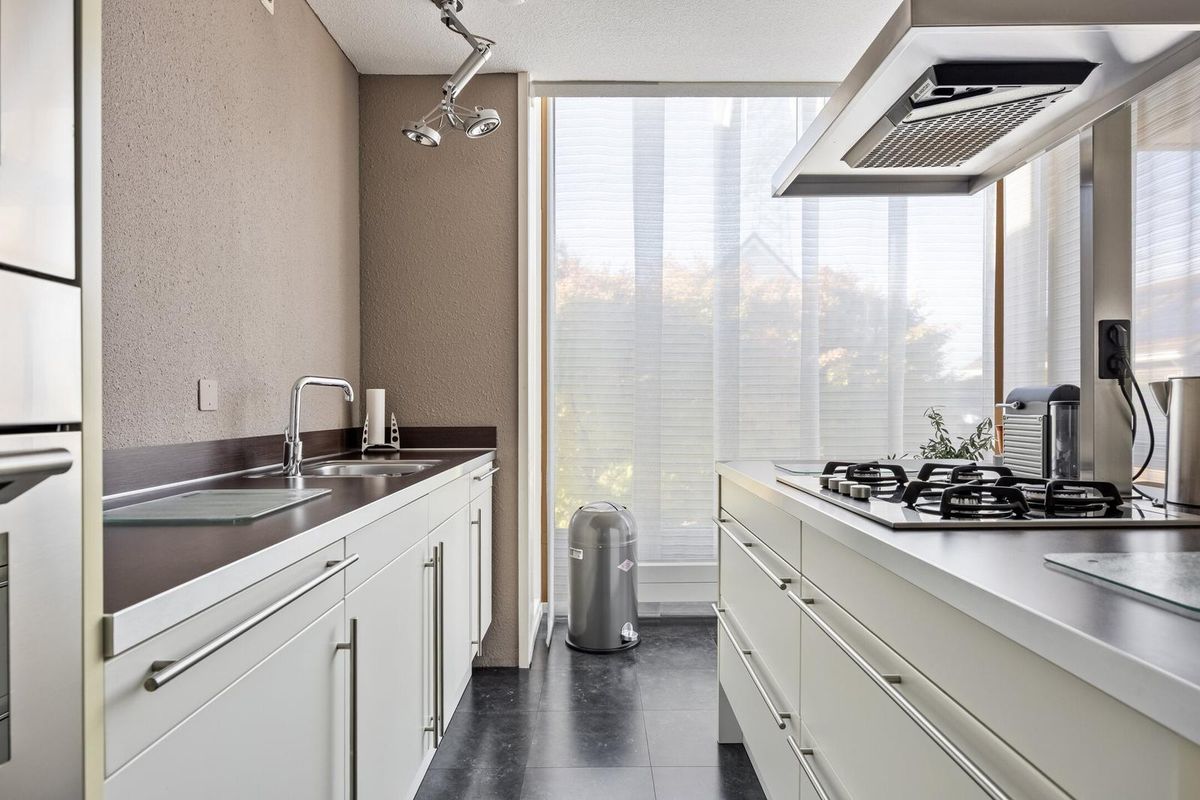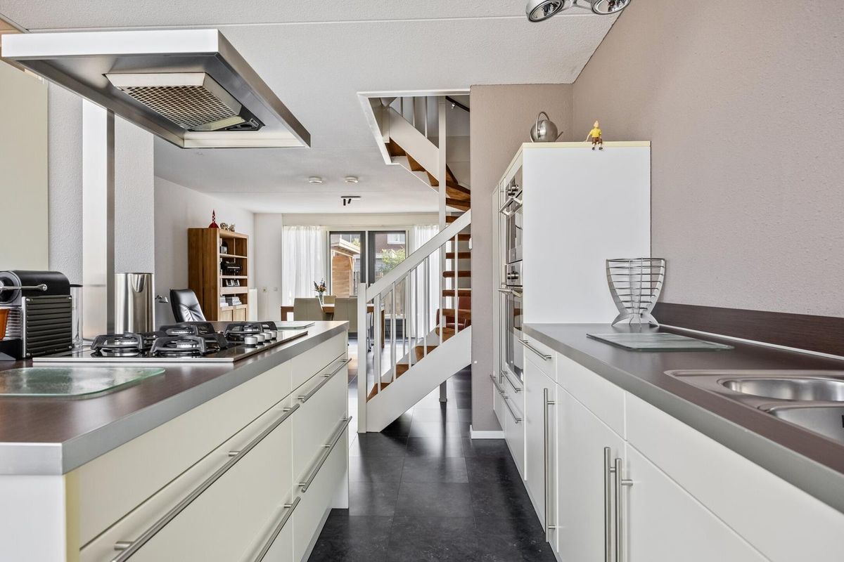 De keuken is voorzien van een gezellig kookeiland en een spoelwand. Het kookeiland is voorzien van een 4-pits gaskookplaat en afzuigkap met voldoende stopcontacten. Het kookeiland dient tegelijkertijd als ‘bar’, waarbij je einde dag met een goed glas wijn de dag door kunt spreken of kinderen gezellig huiswerk aan kunnen maken. De spoelwand is voorzien van een fijne 1,5e spoelbak, combi magnetron, separate oven en koelkast met vriesvak. De trap naar boven bevindt zich naast de keuken.