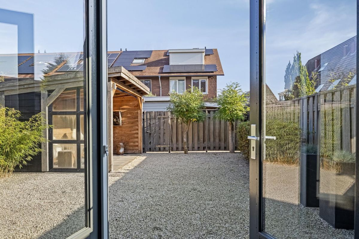 De tuin is op 3 manieren te bereiken: via de dubbele openslaande deuren van de woonkamer, een achterom en via de garage. De aangebouwde stenen garage heeft een achterdeur, waarmee je zo de tuin in loopt. Via hier kun je ook heel makkelijk je containers aan de weg zetten, welke verdekt staan opgesteld in de achtertuin. Tevens is de garage voorzien van elektra.