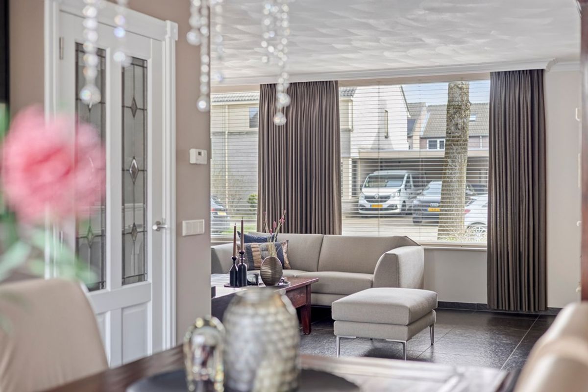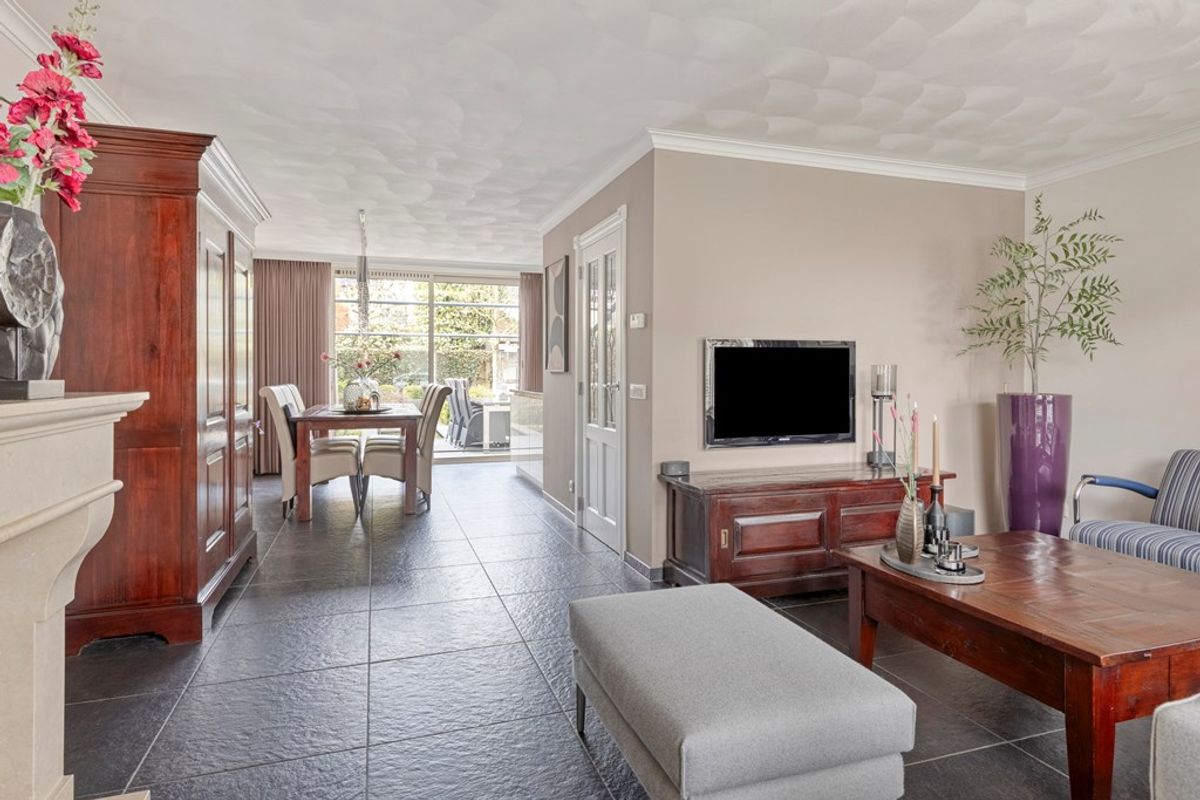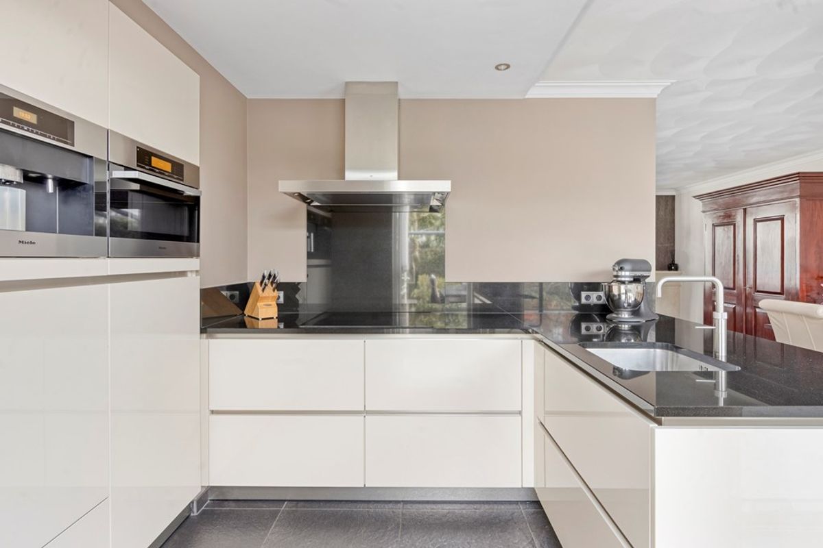 Bij binnenkomst wordt u verwelkomd in de representatieve hal, afgewerkt met een hoogwaardige natuurstenen vloer voorzien van comfortabele vloerverwarming, welke vrijwel de gehele begane grond beslaat. In de hal bevindt zich de moderne toiletruimte, uitgerust met een wandcloset en fontein. Vanuit de hal betreedt u de royale L-vormige woonkamer. De woonkamer is gesitueerd aan de straatzijde en kenmerkt zich door een prettige lichtinval. De ruimte is strak afgewerkt met gestucte wanden en plafonds en beschikt over een stijlvolle gashaard, wat zorgt voor een warme en uitnodigende sfeer. Aan de achterzijde van de woning bevindt zich de keuken, welke in open verbinding staat met de woonkamer en gericht is op de tuin. De moderne keuken is uitgevoerd in een praktische hoekopstelling met een schiereiland en afgewerkt met een luxe natuurstenen werkblad. De keuken is voorzien van diverse hoogwaardige inbouwapparatuur, waaronder een inductiekookplaat, koffieautomaat, vaatwasser, koelkast, afzuigkap en een Quooker. Middels de schuifpui in de keuken heeft u directe toegang tot de achtertuin, waardoor u optimaal kunt genieten van het binnen- en buitenleven.
