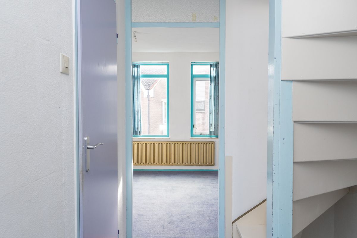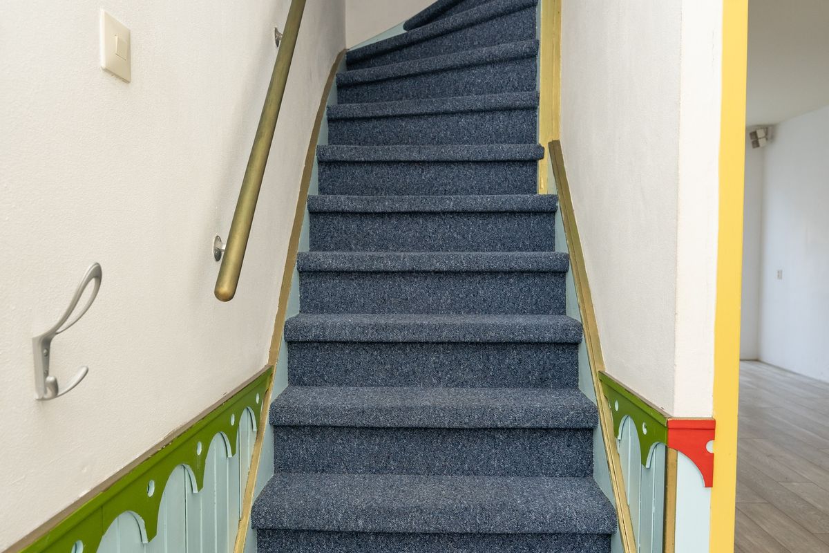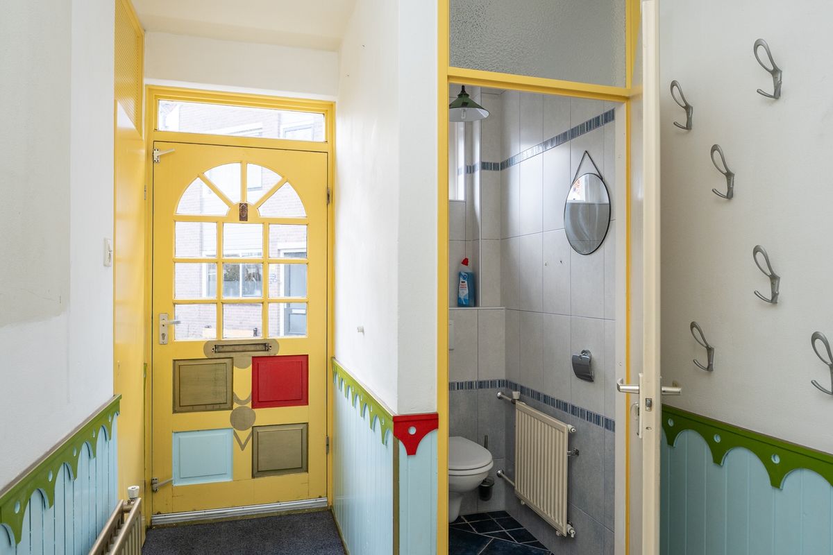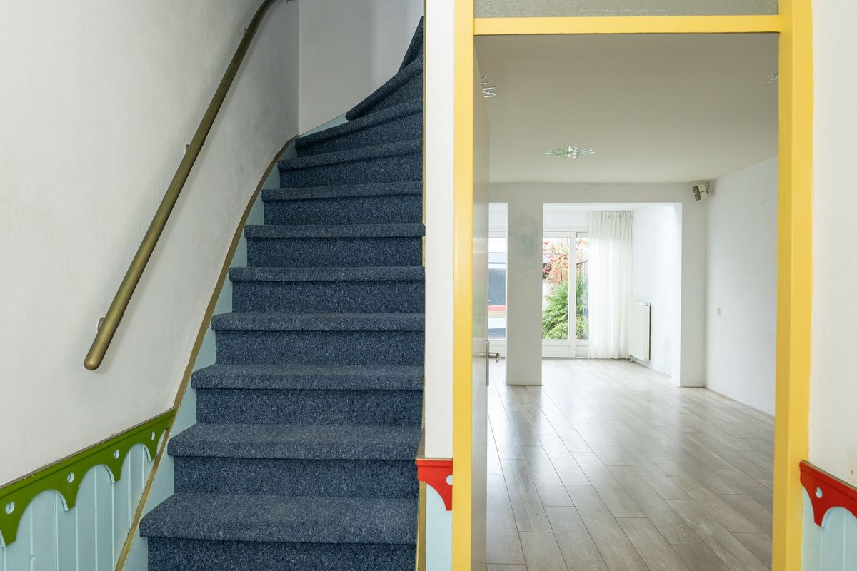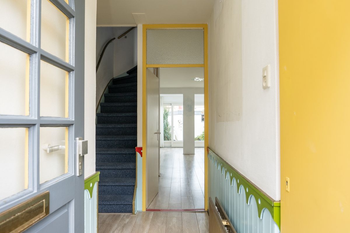 De entree biedt toegang tot de hal met toilet, trapopgang en een doorloop naar de lichte woonkamer.