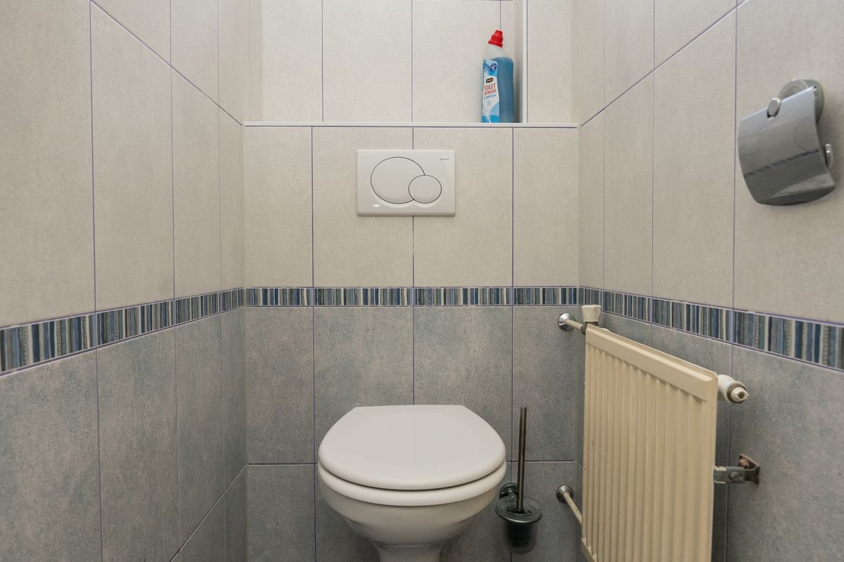 De frisse badkamer is voorzien van een toilet, wastafel en een ligbad met douche.
