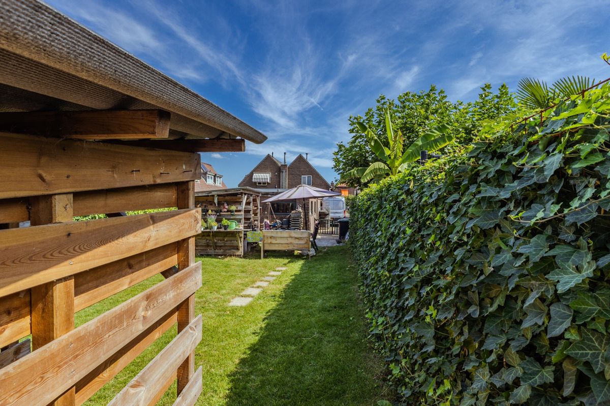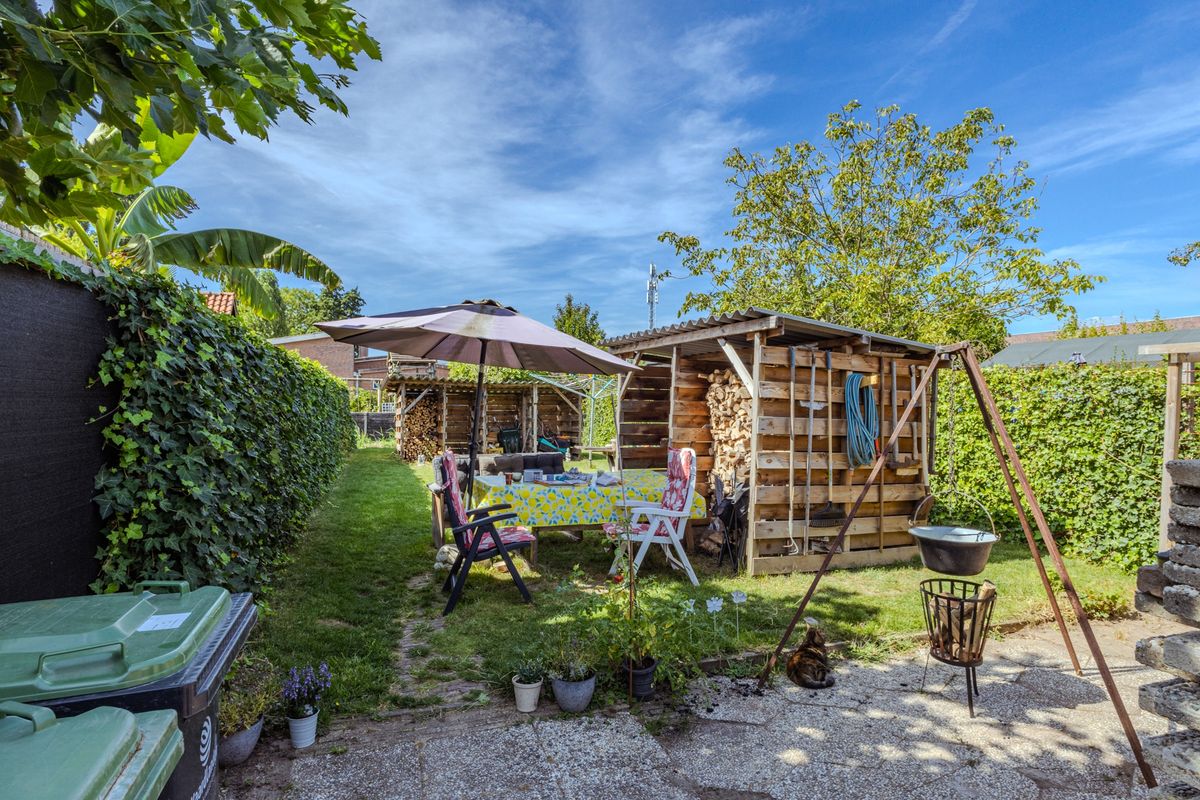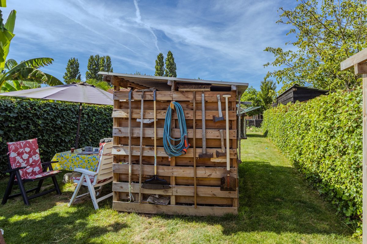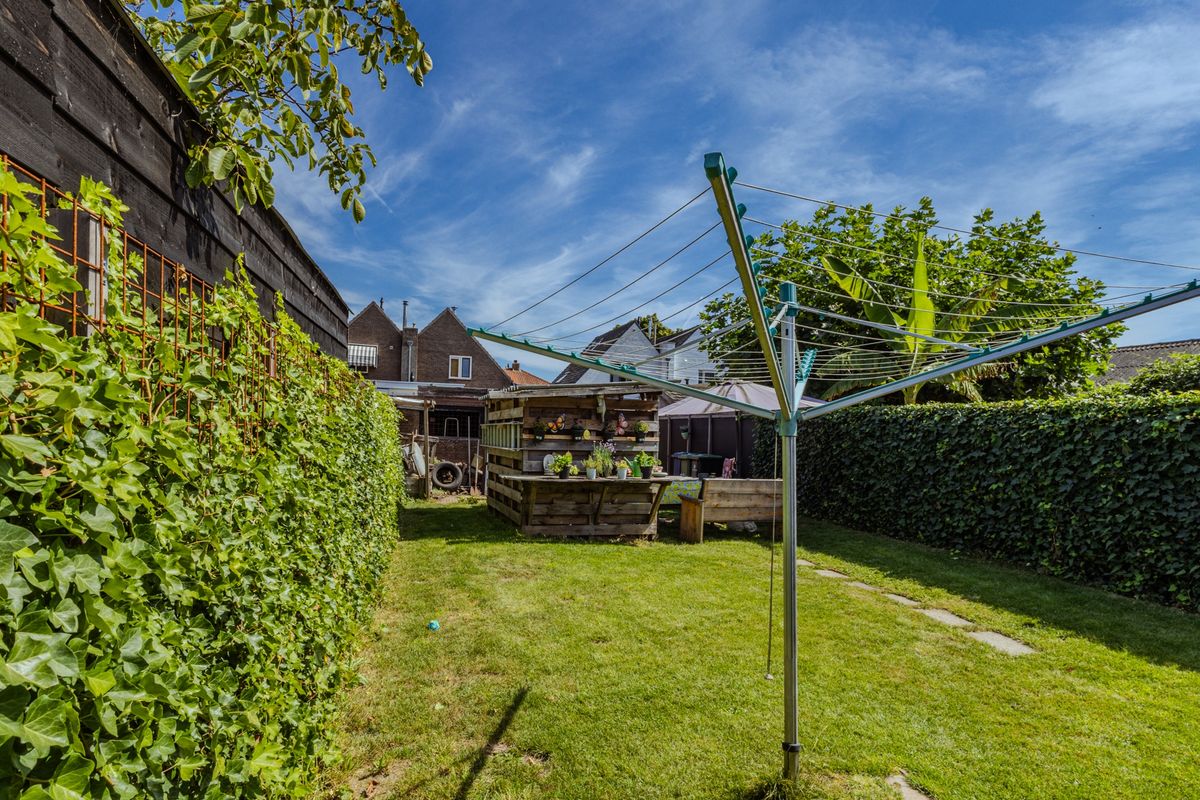 De ruim 40 meter diepe en 5,50 / 7,50 meter brede achtertuin is overwegend aangelegd met een gazon en enkele tegels. Tevens vind je hier twee houtopslagen. Het geheel is aan beide zijden omsloten met hagen.