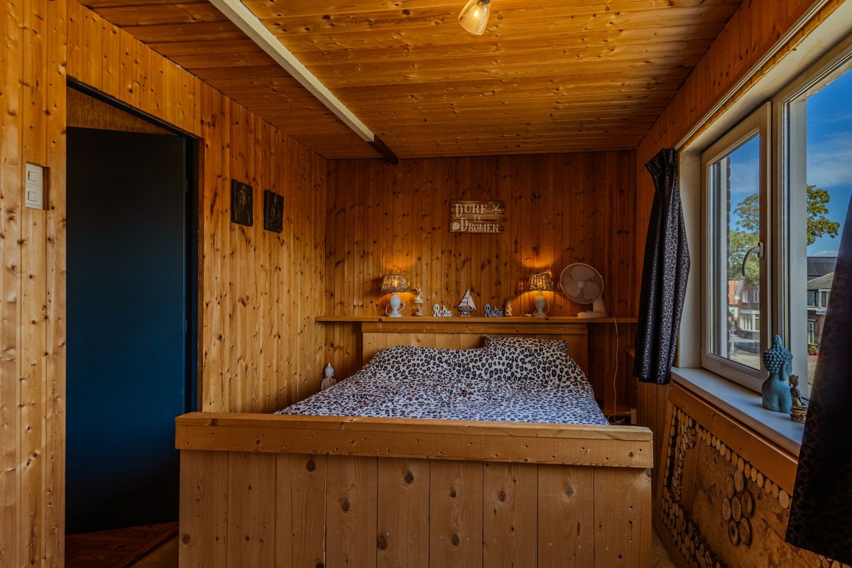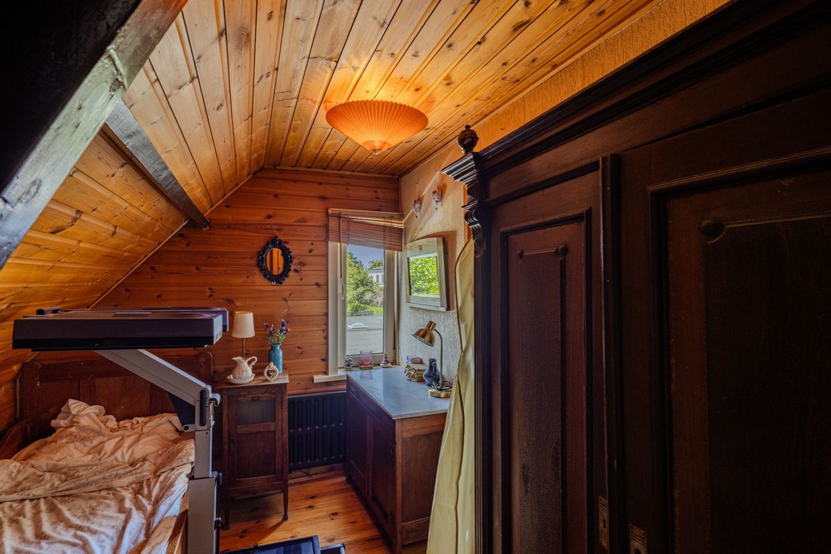Overloop met toegang tot de bergzolder. Gedateerde badkamer uitgerust met een ligbad, douchecabine, 2de staand toilet en een wastafel. 2 slaapkamers zijn gelegen aan de achterzijde van de woning met tussen beide een doorgang. De grootste slaapkamer bevindt zich aan de straatzijde en bestrijkt de volledige breedte van de woning.