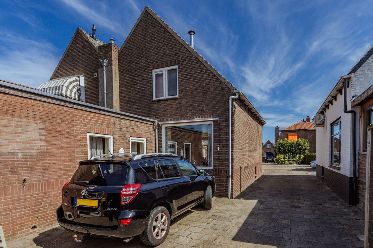 De ca. 5,50 meter diepe voortuin is voorzien van een grindborder. Aan de zijzijde is er een brede toegang tot de achtertuin met heersend recht van pad.