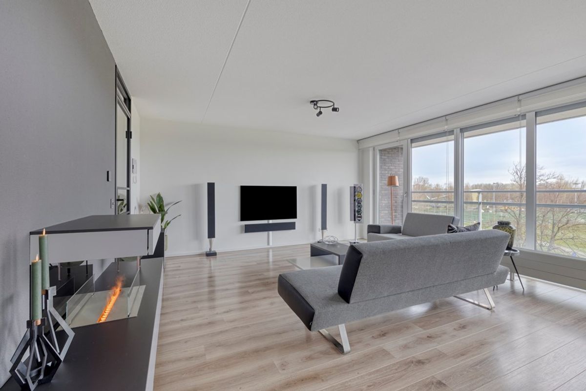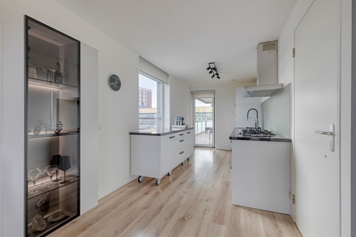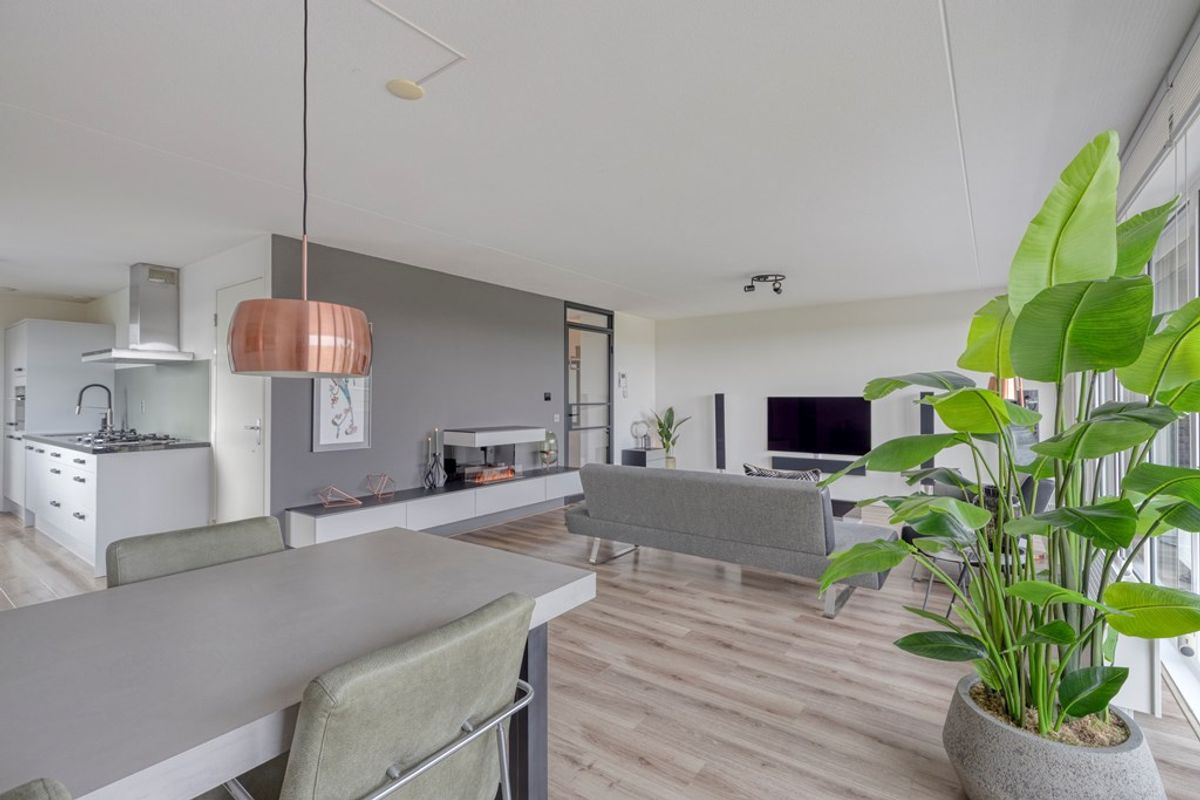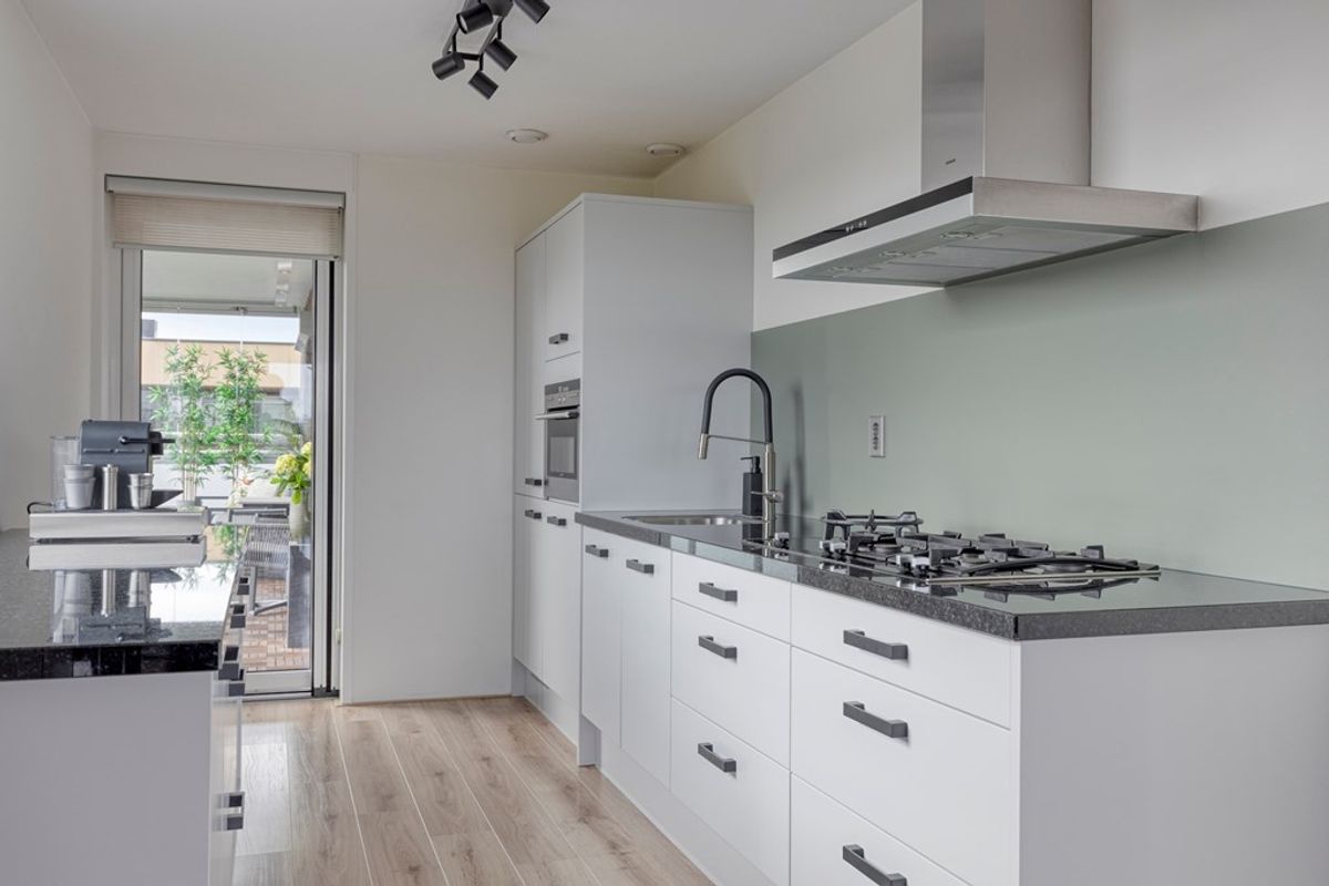 De woonkamer aan de voorzijde is zonder twijfel één van de absolute blikvangers van het appartement. Dankzij de prachtige glazen wand stroomt het daglicht rijkelijk naar binnen en geniet u van een weids en vrij uitzicht op het groen. Dit geeft de ruimte niet alleen een bijzonder lichte uitstraling, maar ook een open en ruimtelijk karakter dat direct aanspreekt. De ramen aan de voorkant zijn voorzien van screens. Hier is volop plaats voor een comfortabele zithoek en een gezellige eethoek, waardoor het een heerlijke leefruimte is voor zowel ontspannen avonden thuis als het ontvangen van familie en vrienden. De open keuken sluit hier perfect op aan en maakt van het woongedeelte een sfeervol geheel. De keuken is uitgevoerd met luxe inbouwapparatuur en biedt alle comfort voor wie van koken en gezellig samenzijn houdt. Praktisch, stijlvol en volledig passend bij het moderne karakter van de woning.
